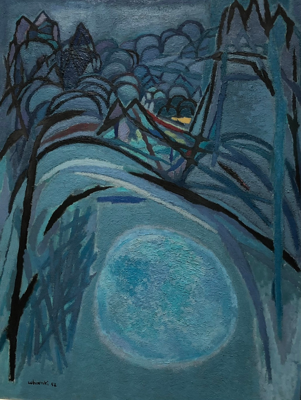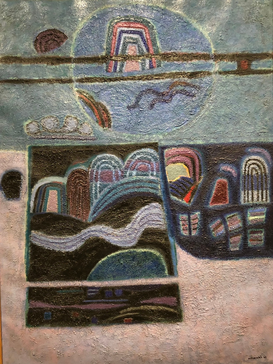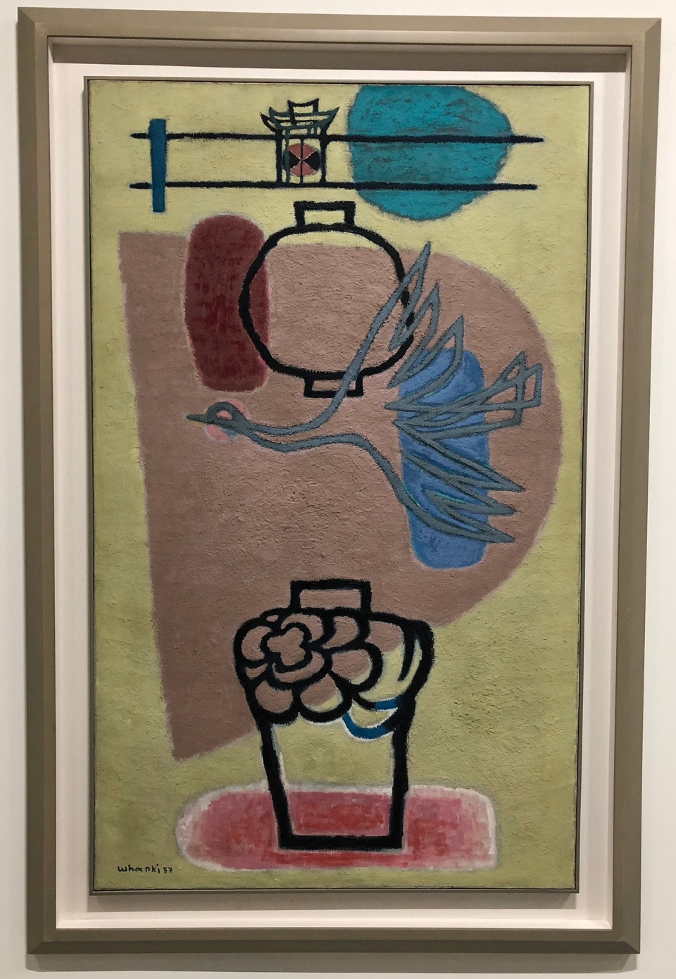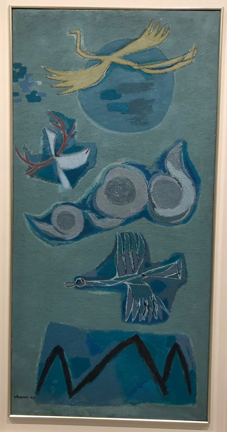 *영원의 노래 2(1957년) - 1956년 파리로 건너간 김환기는 1년 후 1957년에 열린 개인전에서 <영원의 노래>라는 동일한 제목의 유화 두 점을 선보였다. 한 점은 엄정한 격자 구도의 100호 작품이었고 다른 한 점은 푸른 바탕에 산과 달, 구름과 학이 부유하는 듯 열린 구성으로 묘사된 바로 이 작품이다. 작가는 불멸의 십장생 도상으로 자연의 영원성을 표현하고 여기에 '노래'라는 명제를 붙여 다분히 시적인 정서를 작품에 담았다.