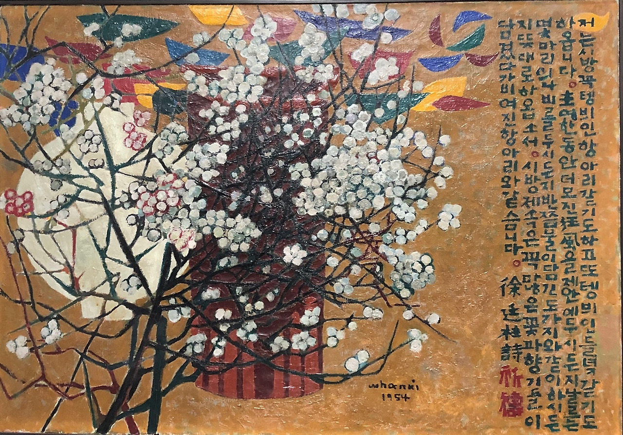 *항아리와 시(1954년) _ 서정주는 당시 김환기가 친교를 나누던 많은 문인 중 한사람으로 김환기는 서정주의 서정적인 시정을 매우 좋아했다. 그가 정갈한 서체로 써 내려간 미당의 시 <기도>는 시인 혹은 시적 영감과 창작을, 사물이 채워졌다 비워지는 항아리에 비유하며 시인으로서의 숙명과 창작의 염원을 함축한 시로, 김환기가 처음으로 시서화 일치를 시도할 만큼 깊이 공감했을 것으로 보인다. 특기할 것은 우리의 시선을 잡아끌며 작품과 전통서화의 연결성을 강화시켜주는 만발한 매화다. 이 작품에서 매화는 그림의 다른 정물 요소들을 가려버릴 만큼 화면을 지배하는 중심 주제로, 캔버스의 가장 넓은 면을 자유로운 선과 점의 구성으로 채우는 대담함에서 작가의 자신감을 읽을 수 있을 뿐만 아니라 이후 20년간 이어지는 추상화의 한 과정으로 읽기에도 부족함이 없다.