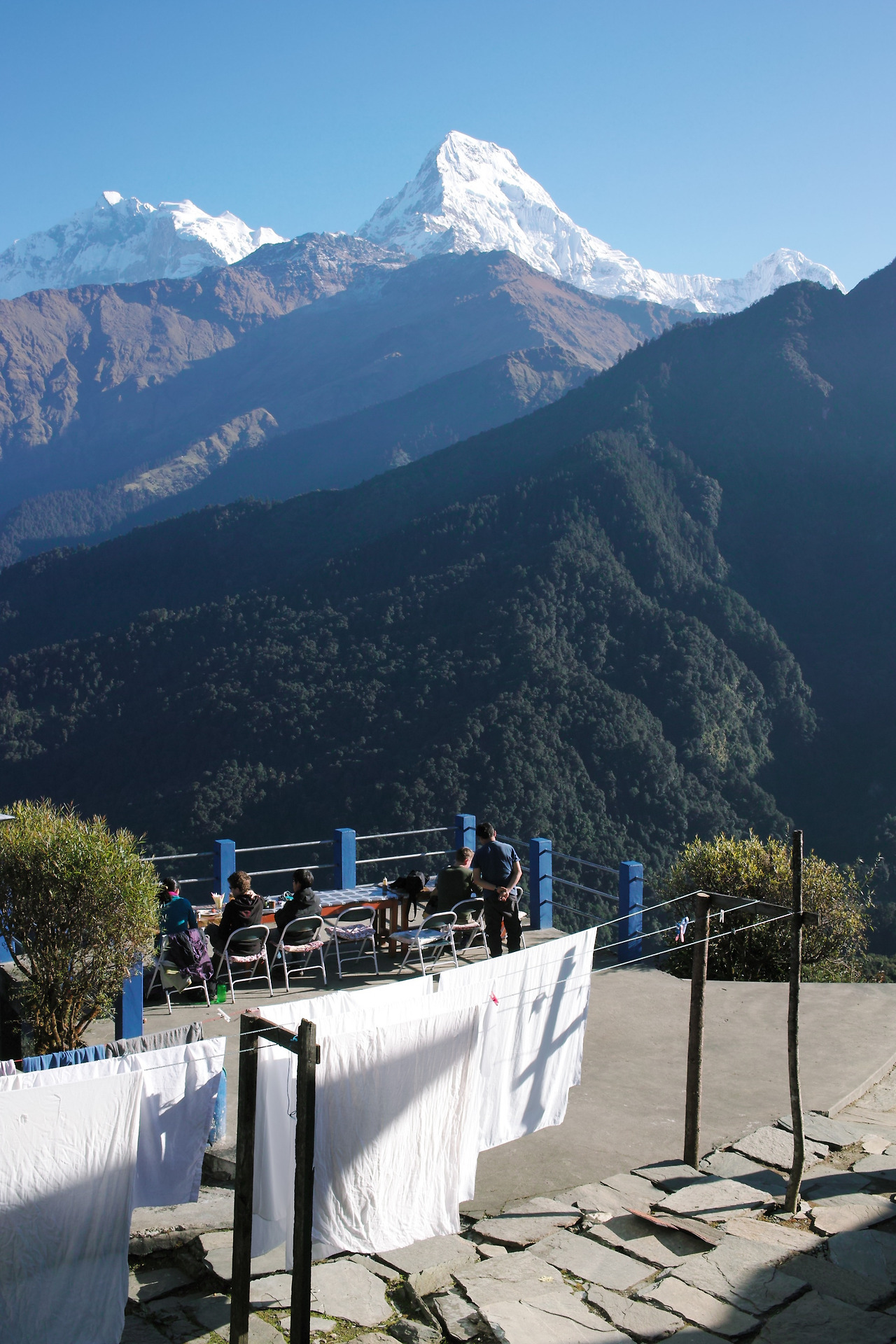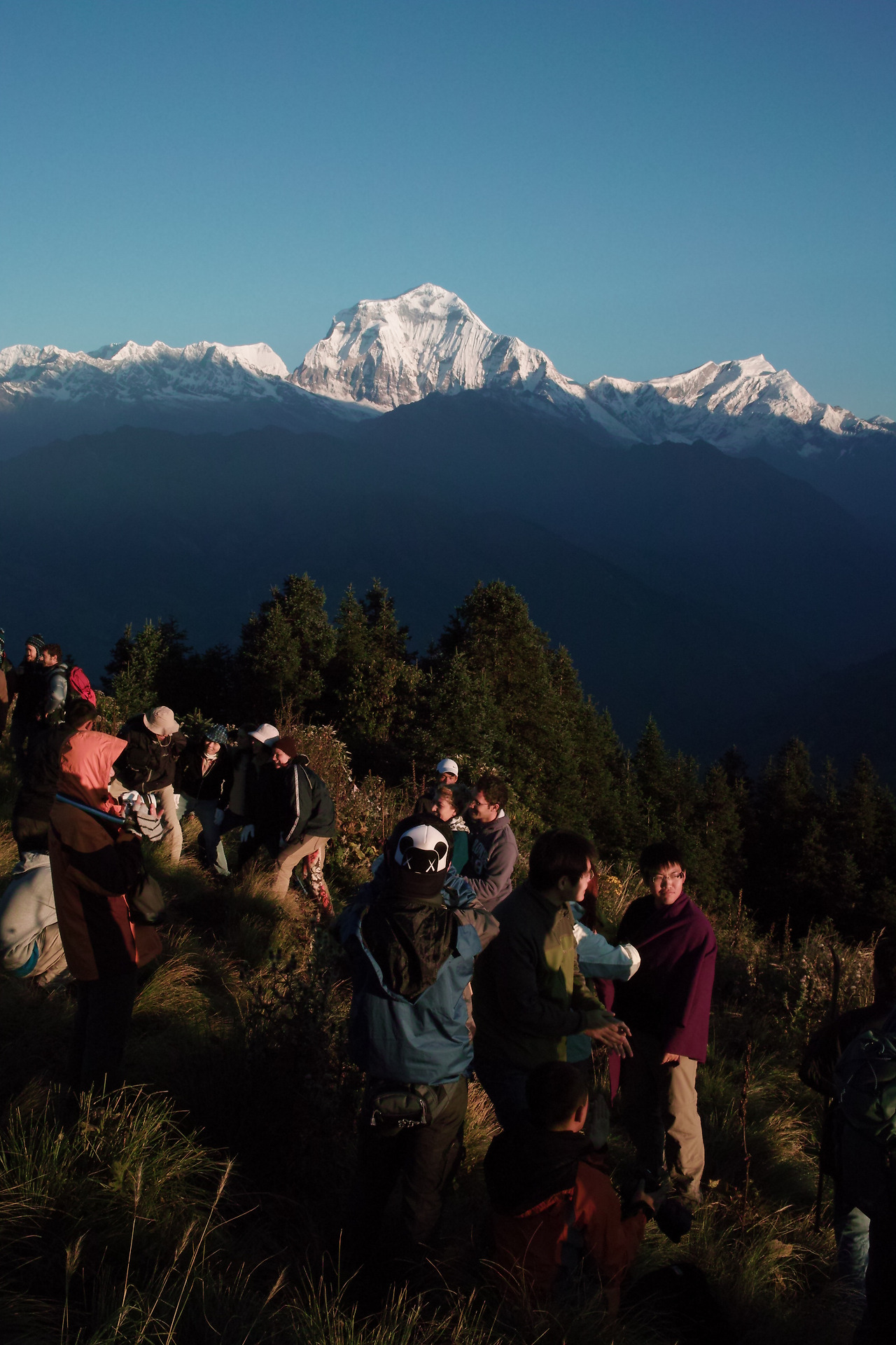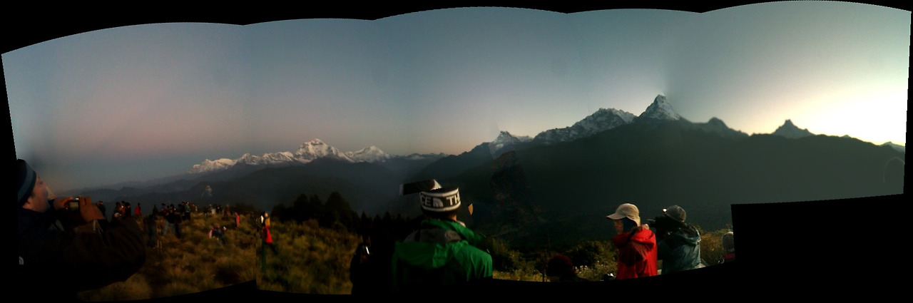 전망대가 있는 언덕에 오르자 대기는 좀 더 환하게 바뀐다. 멀리 다울라기리 산군이 보인다. 해발 8167m의 세계 7위 봉이 하늘 높이 우뚝 솟아 있다. 그 옆으로 안나푸르나 쪽 봉우리들과 마차푸차레까지 훤히 보인다. 어제까지 비 구름 속에 감춰졌던 히말의 신비로운 모습이 '짠'하고 나타난다. 어제까지만 해도 못 볼 줄 알았는데 구름 한 점 없는 멋진 날씨 속에 마주하게 되다니... 감격스럽다.