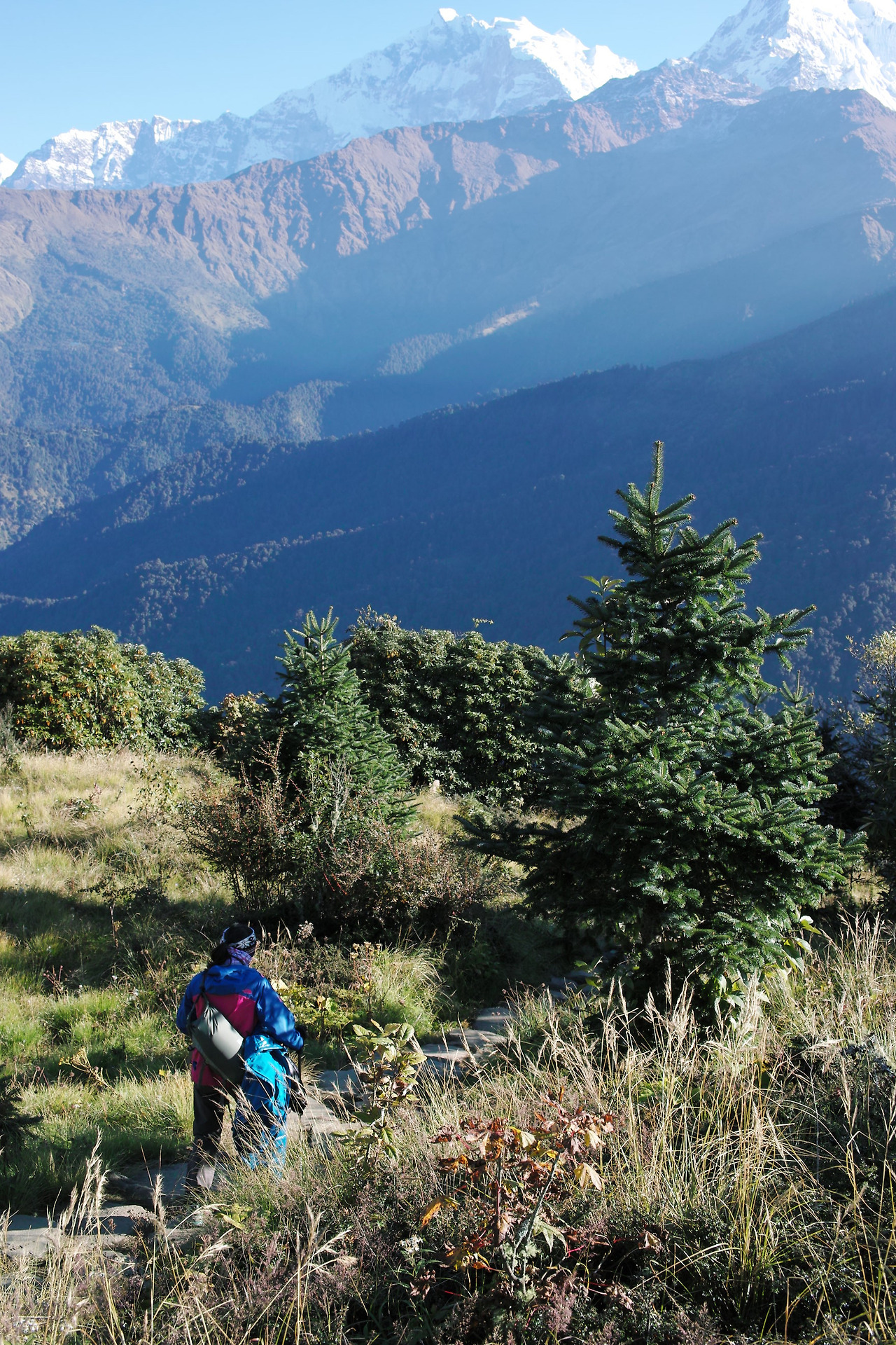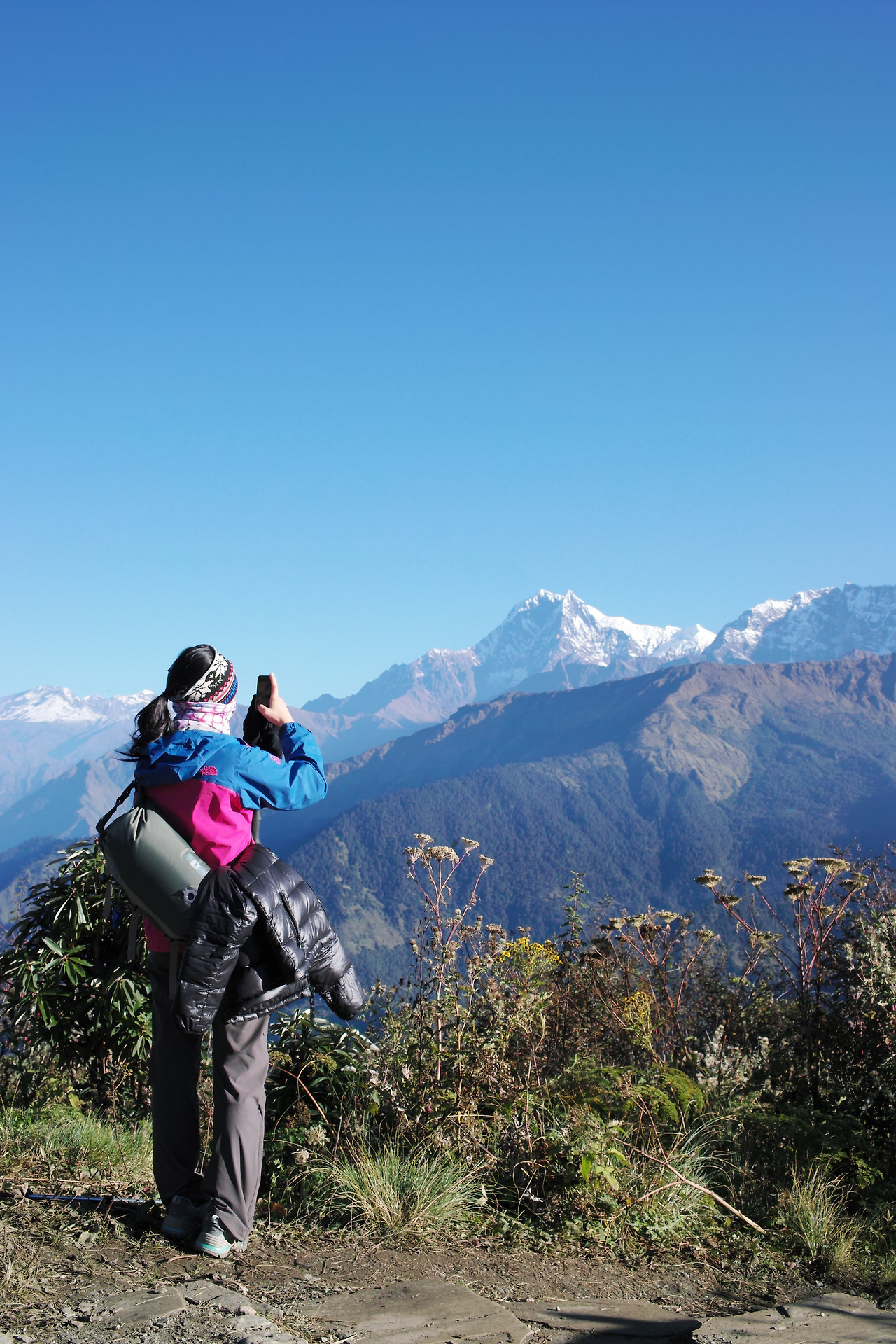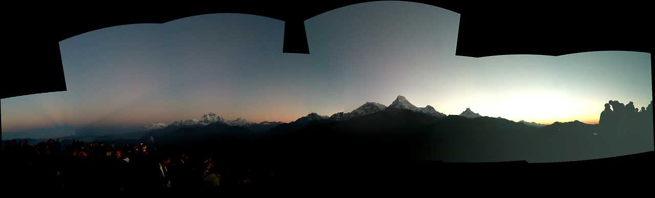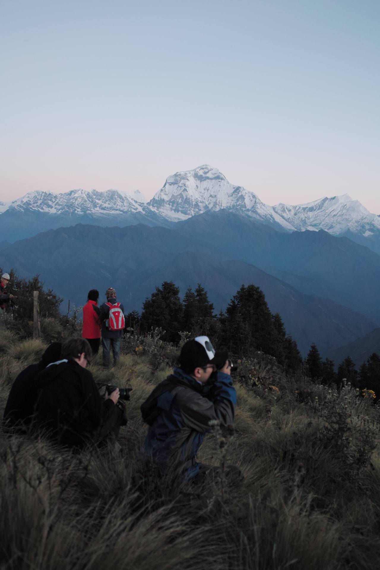 전망대가 있는 언덕에 오르자 대기는 좀 더 환하게 바뀐다. 멀리 다울라기리 산군이 보인다. 해발 8167m의 세계 7위 봉이 하늘 높이 우뚝 솟아 있다. 그 옆으로 안나푸르나 쪽 봉우리들과 마차푸차레까지 훤히 보인다. 어제까지 비 구름 속에 감춰졌던 히말의 신비로운 모습이 '짠'하고 나타난다. 어제까지만 해도 못 볼 줄 알았는데 구름 한 점 없는 멋진 날씨 속에 마주하게 되다니... 감격스럽다.