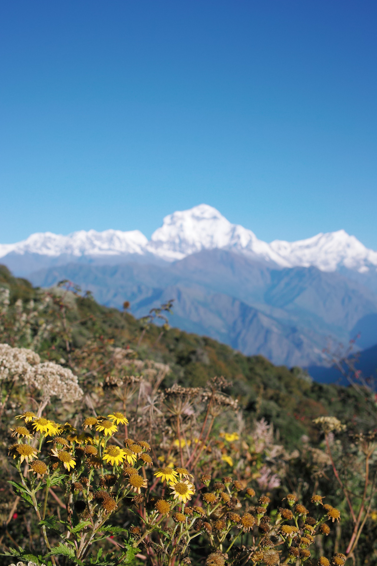 그렇게 한참을 앉았다가 드디어 엉덩이를 털고 일어섰다. 오늘 갈 길이 멀다. 더 지체하다가는 밤새 걸어야 할 지도 모른다. 아쉽지만 가자. 내려가는 길은 들꽃들이 반겨준다. 들꽃들 너머로 하얀 설산이 있다니... 생각할수록 말도 안 되는 이 풍경에 자꾸만 가던 길을 멈추게 된다.