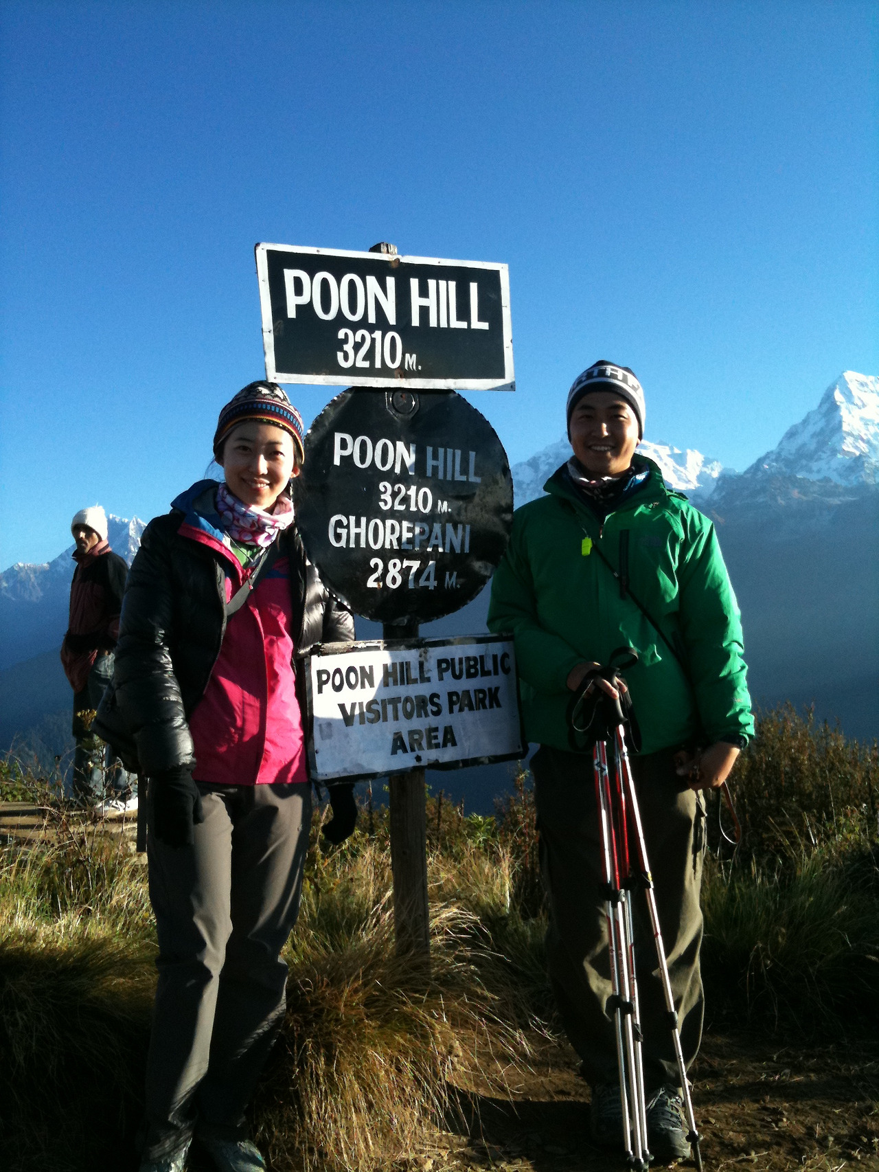 이 멋진 일출을 함께 한 우리 트래커들은 순식간에 너나없이 한 배를 탄 동지가 되어 기뻐한다. 말 한마디 나눠보지 못한 사람들이지만 서로 엄지를 척 들며 감격을 표한다. 옆에 있던 일본, 미국, 스웨덴 출신 다국적 트래커들과 함께 어깨동무를 하고는 기념사진까지 찍는다. 그다음은 3210m를 자랑하고 있는 푼힐 표지판 앞에서의 인증샷. 저 표지판 녀석은 얼마나 많은 사람들의 사진 속에 당당히 자리하고 있을까?