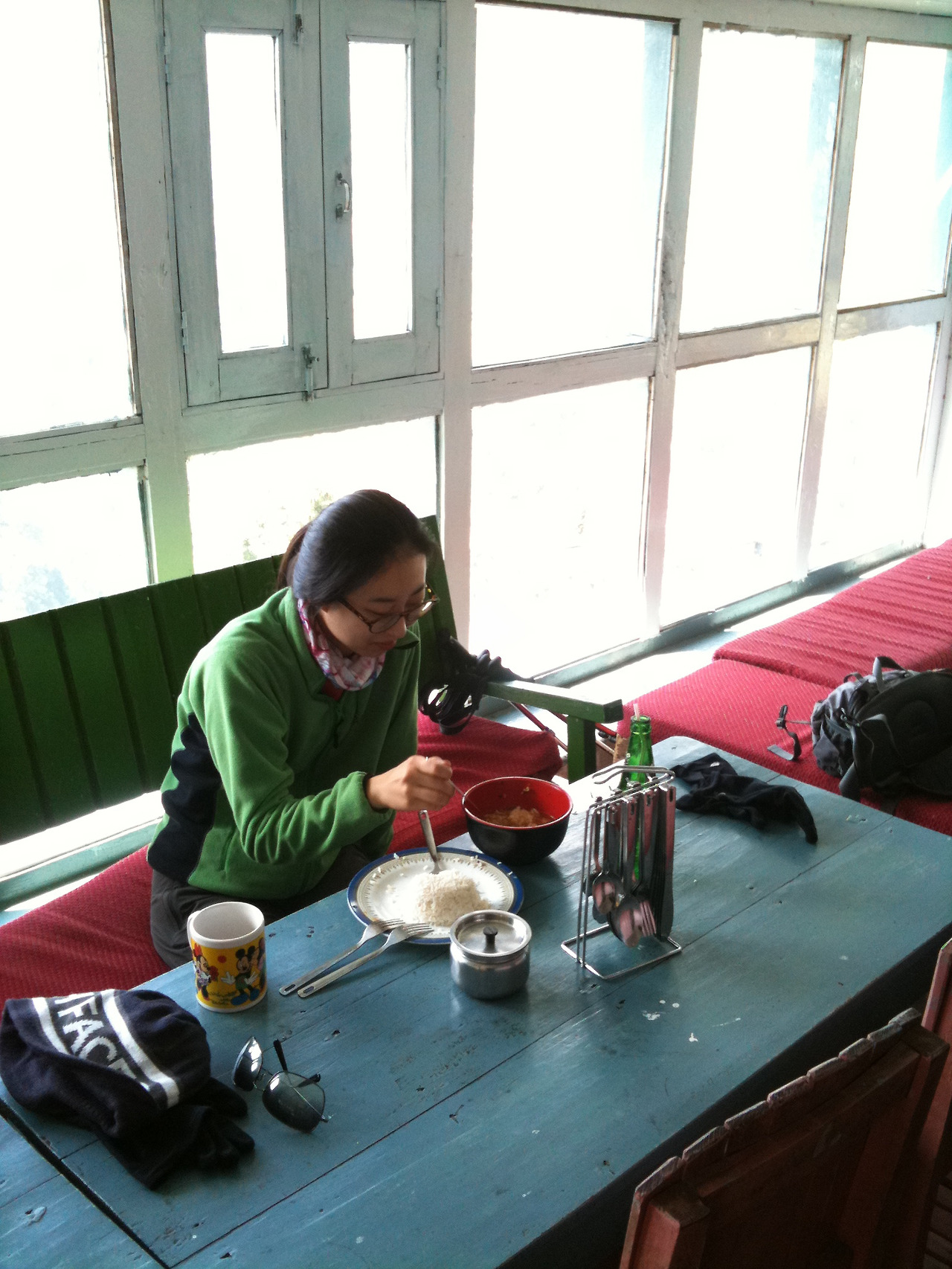 그래, 얼른 들어가자. 뭐든 먹어야 겠다. 메뉴에 당당히 신라면이 적혀 있다. 와우~ 우리나라 사람들 대단하다. 이 산속에서 얼마나 신라면과 백숙을 찾았기에... 공급은 수요를 따르는 법. 어쨌거나 반갑다. 정말 무지 반갑다. 라면 반개에 우리 돈 6000원. 비싸다. 흑. 그래도 먹어야지. 두개를 주문하고 공기 밥도 주문해서 한 입에 털어 넣는다. 역시 이 맛이지.