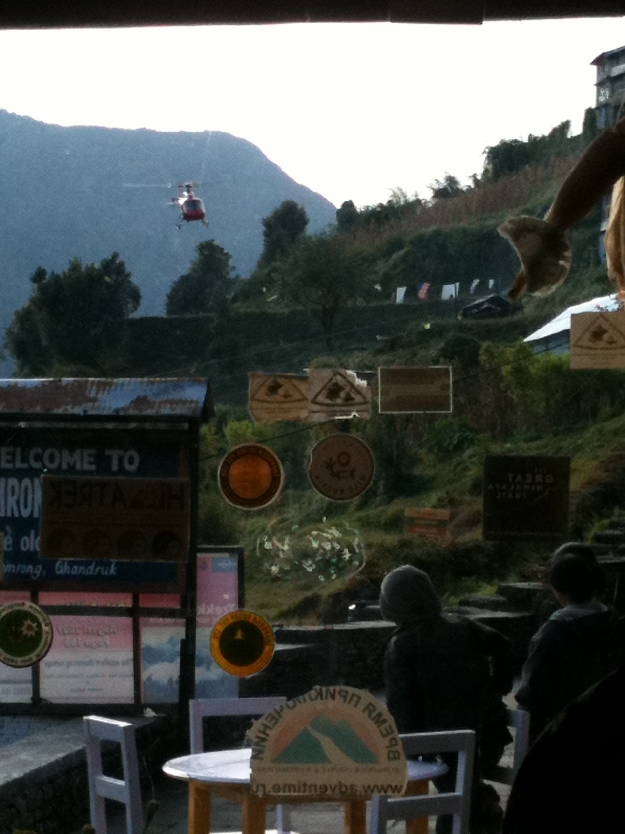 촘롱에서 잘 먹고 잘 쉬었다. 어제는 푼힐에서 일출을 보느라 너무 일찍 일어나는 바람에 많이 피곤했다. 그래서 오늘은 아침을 먹고 좀 쉬다가 넉넉하게 출발 하기로 한다. 메뉴는 간단하게 계란 볶음밥. 식후 티타임으로 깔로찌야(블랙티) 한 잔이다. 설탕을 뜸뿍 넣고는 여유 있게 마시고 있는데 계곡 아래에서 헬기 한대가 요란하게 다가온다.