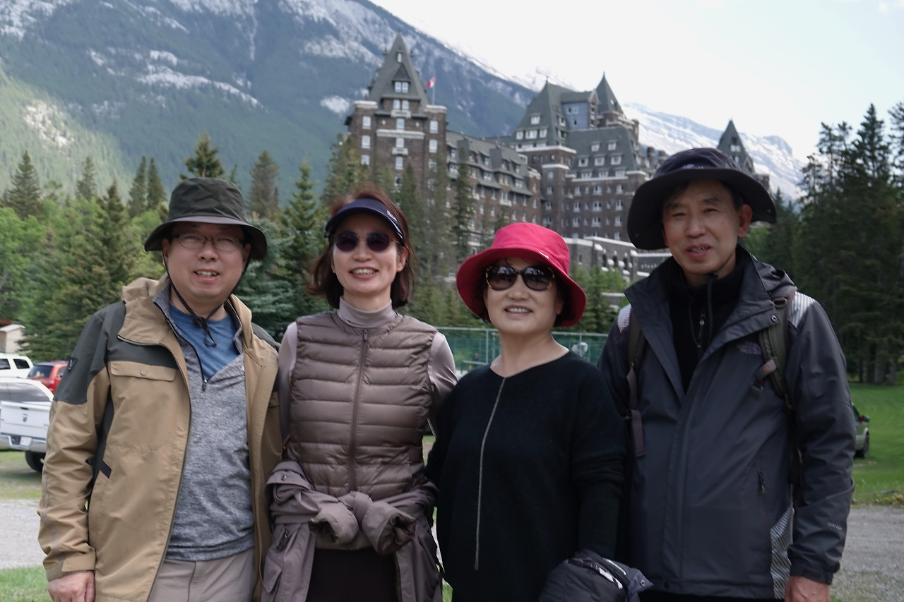 밴프에 도착하여 숙소에 일단 짐을 푼 후 밴프 곤돌라(Banff Gondola)를 타고 설퍼 산(Sulphur mountain) 자락에 위치한 스카이 비스트로(Sky bistro)가 있는 전망대까지 가기로 하였는데, 그곳 레스토랑에서 우아하게 밴프 주변의 로키산맥의 산들을 바라보며 식사를 할 수 있었지만, 우리 일행은 가성비가 떨어진다고 생각하여 전망을 보고 내려와 밴프 시내에서 저녁식사를 하기로 하였는데, 다행히도 한국 식당을 발견하여 그곳에서 식사를 하기로 하였다. 이번 여행에서 처음으로 가는 한국식당이라 그동안 서양식 음식에 괴로워하던 나의 아내와 곽 형제님께서 제일 반기시는 듯하였다. 곤돌라 예약 시간이 남아 고색창연한 페어먼트 밴프 스피링스( Fairmont Banff Springs)호텔에 들려 잠시 차를 주차해놓고 주변을 둘러보며 산책하다 보니 보우 강변까지 내려가게 되었다.