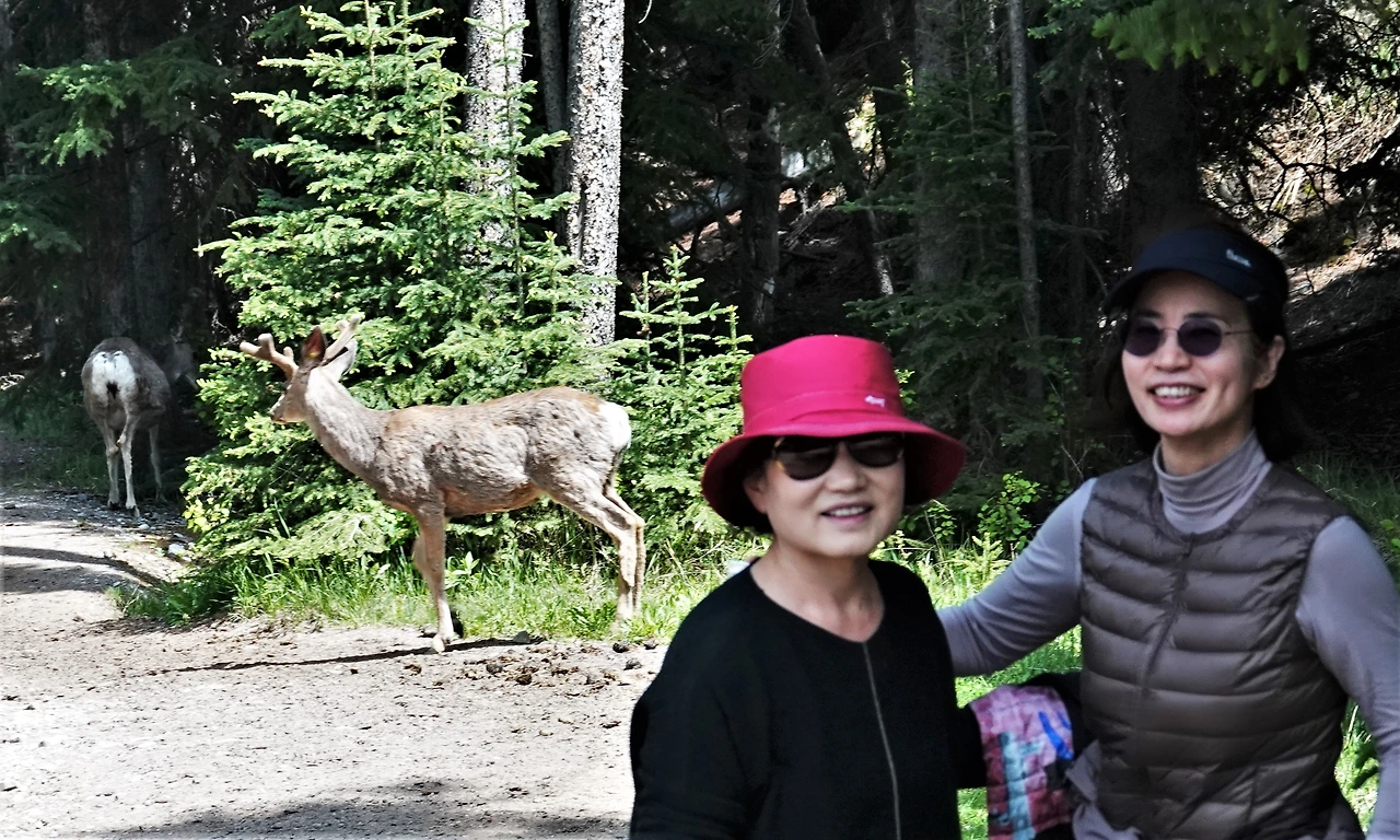 보우강가를 거닐다가 주차한 곳으로 돌아가는데 드디어 근접거리에서 서너 마리의 사슴들을 발견하였다. 인적이 드문 보우 파크밸리에서도 보지 못했던 것을 이렇게 관광지에서 보다니, 이 사슴들은 사람을 전혀 두려워하지 않고 근접거리에서도 풀을 뜯으며 유유히 거닐고 있었다. 우리에겐 너무 신기한 장면이라 자꾸 뒤를 돌아보다 발길을 돌려 곤돌라 주차장으로 향하였다. 밴프는 재스퍼에 비하면 도시와 같아 번잡하였으나 그래도 우리나라에 비하면 소도시 규모 보다도 작아 보였다.