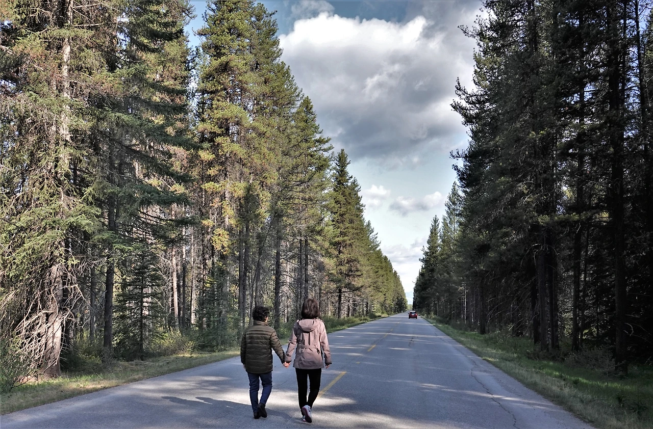 보우 밸리파크웨이를 달리는 동안 차량을 한 대도 발견할 수 없었던 우리는 도중에 차를 세우고 길 양 옆으로 하늘을 향해 손을 높이 벌리고 서있는 듯한 침엽수들을 배경으로 온갖 포즈를 취하면서 사진을 찍어 가며 깔깔거리고 즐겁게 자연 속에 녹아들어 가고 있었는데, 빨간색 차를 탄 백발의 노부부가 우릴 지나다 다가와 서더니 무슨 일이 있나고 물었다. 도움이 필요하냐고 하여 우리는 웃으며 아니라고 하니 도움이 필요하면 이야기하라고 하시며 미소를 머금고 두 분이 저 멀리 사라져 갔다. 친절한 현지 캐나다인이셨다. 이 길에서 그날 본 유일한 차량이었다.