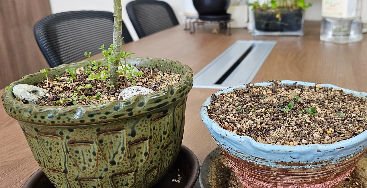 과학자들이 발견한 것처럼 뿌리를 통해 엄마와 소통하고 영양분도 분배받은 탓일까? 아니면 단순히 화분의 흙의 성분이 달라서일까? 후자라고 생각하기에 그 정도 흙의 성분이 차이가 날 것 같진 않아 다큐멘터리에서 본 내용이 사무실 안 내 화분들 속에서도 일어나고 있는 자연현상인 것 같아 흥미진진하였다. 식물도 육아를 하는구나. 생명의 신비! 우리가 다 알지 못할 놀라운 생명의 비밀들이 아닌가? 내 사무실 안에 작은 비밀의 실험실이 생긴 셈이었다.