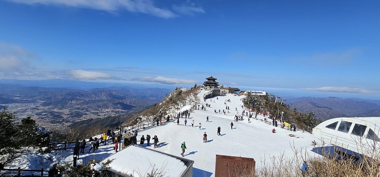 무주 리조트 곤돌라 정상에 내려보니 안개에 싸인 풍광이 신비를 자아내고 있었다.