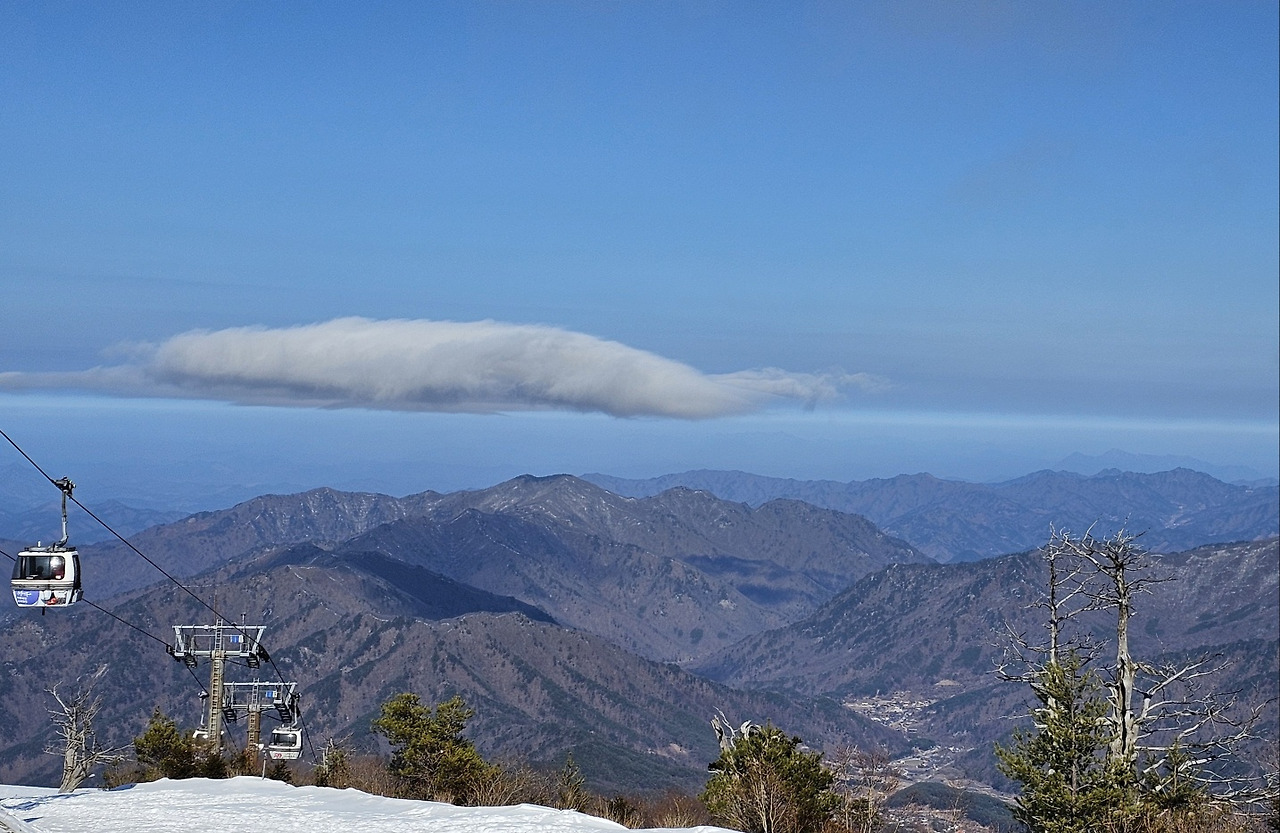 곤돌라 하나에 5~6명씩 꽉 채워 올리는 바람에 우리 가족은 두 명의 스키어들과 함께 오르게 되었다. 그런데 두 사람인데 곤돌라 안에 스노보드를 하나만 갖고 올라타서, 겨울철 스포츠와 거리가 먼 나는 의아해 하며 두 사람이 하나의 보드를 타냐고 물었더니 그 청년들이 웃으며 하나는 곤돌라 문밖에 세워두는 곳에 두었고 자기 것은 사이즈가 맞지 않아 갖고 탔다고 말하였다. 그제야 곤돌라 문 밖을 보니 스노 보드가 하나 더 세워져 있었다. 올라가는 시간이 길다 보니 이 청년들과 이 이야기 저이야기하며 올랐는데 덕유산 스키장이 우리나라에서는 가장 긴 스키코스라고 하였다. 그들은 일 년 권을 50여만 원에 사서 시간 나는 대로 겨우내 스키를 타는 모양이었다. 이 낯선 겨울 스포츠에 대한 그들의 말에 연신 우리가 감탄을 하자 스키장에 연한 티롤 호텔에서 커피를 마실 것을 권해주었다. 오스트리아 티롤지방에서 직접 나무를 가져와 그곳 방식과 형태로 지은 호텔이라 이국적이고 유럽식 정취를 느낄 수 있는데, 한 번은 불이나 타기도 하였는데 마침 자신이 그때 스키장에 있어 목격하였노라고 하며 도란도란 이야기를 듣다 보니 정상에 도달하였다. 청년들의 스키와 더불어 겨울철 스포츠의 다양한 체험을 들려준 데 대해 감사하단 인사와 함께 헤어지고 밖으로 나와 보니 안개가 바람에 옅어졌다 진해졌다 하면서 신비로운 풍경을 더하고 있었다.