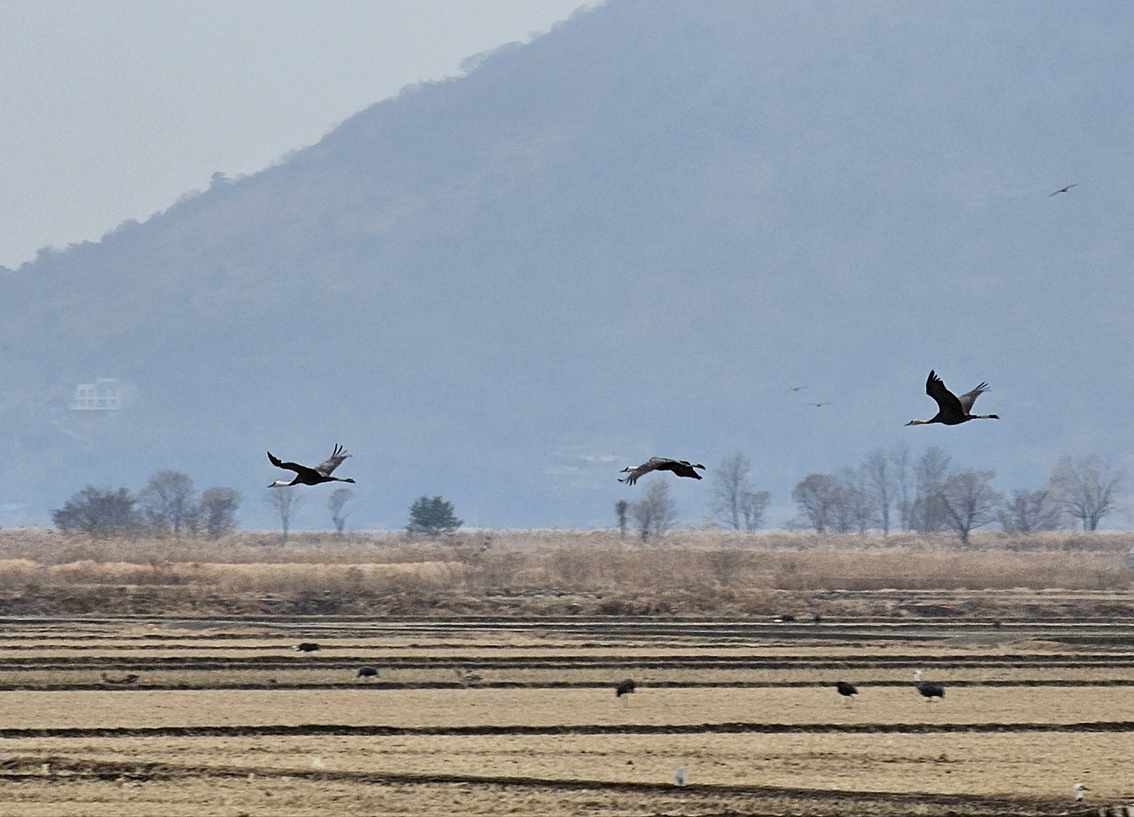 날개를 편 흑두루미가 우아한 비행을 하고 있다. 중국 선양에서 날아왔다고 하는데 착륙 허가증은 가지고 왔는가? 사람은 이동에 제한이 있지만 너희는 자유롭구나.