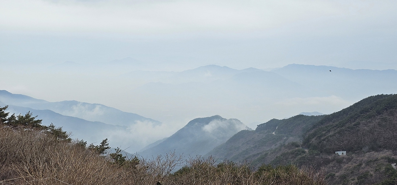 한참을 올라도 오는 차, 가는 차 한 대 없어 슬슬 겁이 더 날 무렵, 차량 한 대가 내려오는 것이 보여 다소 안도의 한숨을 쉴 수 있었다. 어쨌든 길은 뚫려 있는 것이 증명된 셈이었다. 그렇게 졸인 마음으로 오르다 보니 시암재 휴게소가 보였고 그 이상 가는 길은 막혀 있었다. 그리고 저 멀리 육안으로 성삼재 휴게소로 보이는 건물이 보이는 것 같았다. 언제 왔는지 앞서 우리 보다 먼저 주차한 것으로 보이는 차에서 젊은이들 세 명이 산행차림으로 우리에게 오며 찻길은 막혔지만 저위로 오를 수 있냐고 물어왔다. 우리가 경험 많은 산악인들로 보였나? 우린 웃으며 시암재 휴게소는 열려 있으니 그 직원들에게 물어보라고 하며 우리도 주차하고 커피도 마실 겸 휴게소로 향하였다. 휴게소에서 보이는 지리산 국립공원일대의 산들이 구름과 안개에 뒤덮여 고즈넉하게 펼쳐져 있었다.