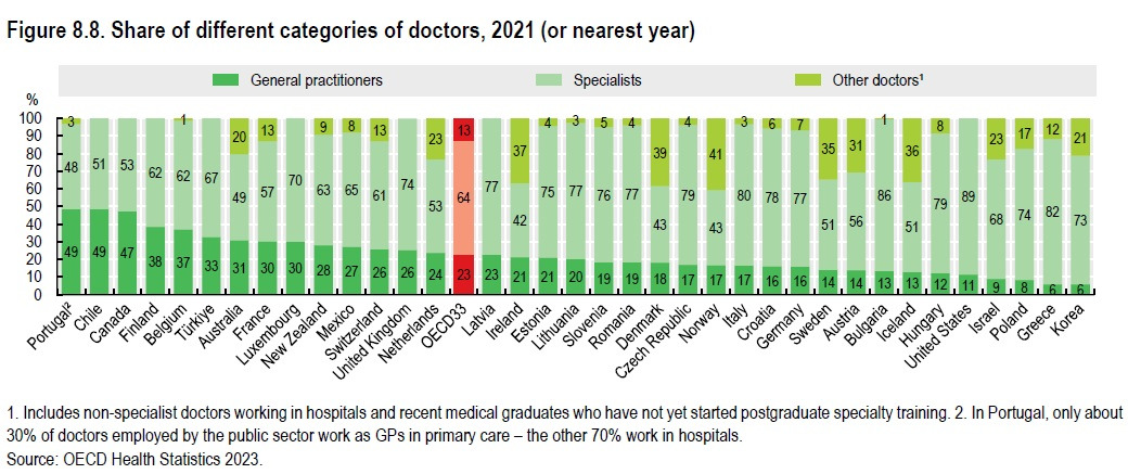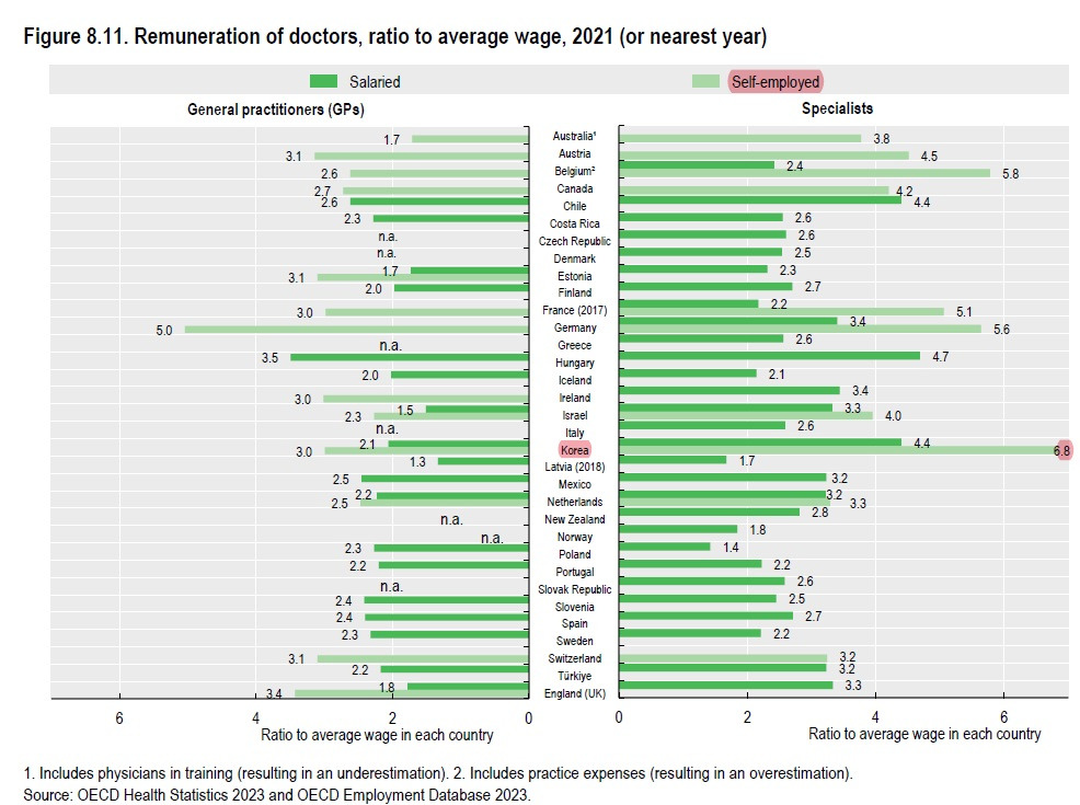 그래프의 우측이 전문의들에 대한 도표인데 우리나라는 자영업형태를 띤 의사활동 수가 현저히 많은 것을 볼 수 있다.