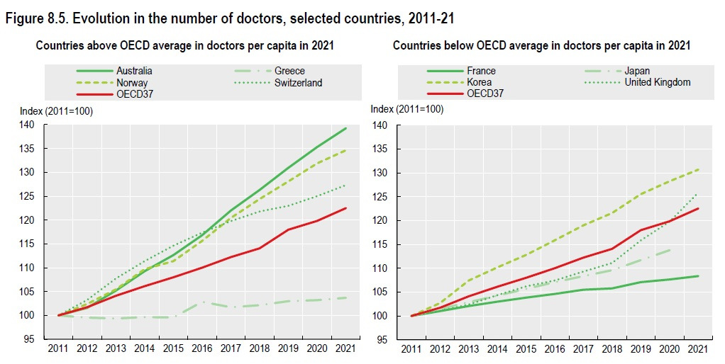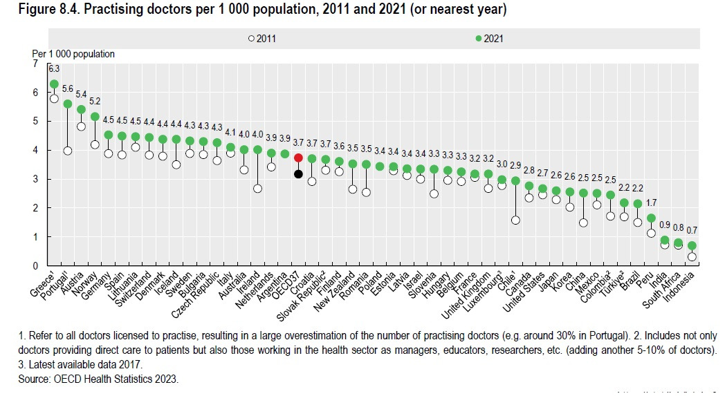 우리나라의 의사수는 부족할까? 단순히 이 질문에 OECD데이터를 보면 그렇다고 답할 수 있다. 다음 그림은 OECD health data 2023년에서 발췌한 것이다. 인구 1000명당 의사수는 OECD평균 3.7명인데 반해 우리나라는 2.6으로 하위 3/4 군에 속한다. 그러니 상대적으로 보면 부족해 보인다.