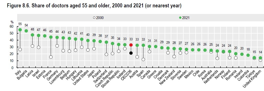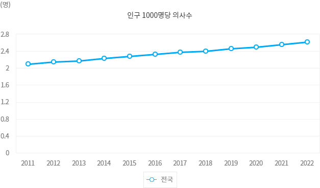 그런데 의사들이 상대적으로 적은 국가들의 지표 변동 추이를 보여주는 하기 그림을 보면 지표의 개선률이 OECD평균을 웃돌며 높은 성장세를 보이고 있다. 이는 국가지표에서 제시하는 연도별 추이곡선에서 보아도 이 지표가 성장세를 보이며 지속적으로 개선되어 가고 있는 것을 보인다. 그리고 더 흥미로운 데이터는 55세 이상의 의사들이 차지하는 비율을 보면 우리나라는 26%로 OECD 평균 33%보다 현저히 낮다. 이 말은 우리나라의 의사들은 상대적으로 더 젊다는 것이다. 즉 나이 든 의사들보다 젊은 층에서 의사들이 자라 나오고 있어 인구 1000명당 의사수는 상당기간 더 상향 곡선을 보여줄 것으로 예측할 수 있다.