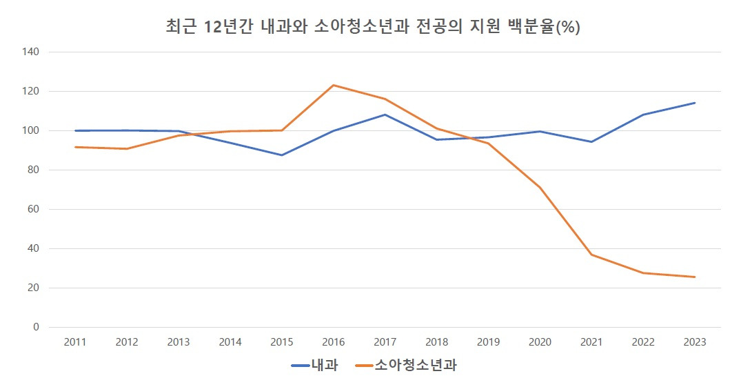 이러한 일련의 요인들은 가장 먼저 소아청소년과를 지원하는 수련의 지원율의 급감으로 반영되어 나타나기 시작하였다. 다음 도표는 소아청소년과가 제공한 데이터를 사용하여 작성해 본 것이다. 2018년 이후 소아청소년과 수련의들은 현저히 감소하기 시작한다. 문제는 이렇게 수련의들이 감소하면 기존에 있던 수련의들 조차 업무 과중으로 인해 더 이상 수련을 지속할 동력을 잃게 되어 중도 탈락으로 이어질 수 있다는 것이다. 우리나라의 미래 소아청소년과를 짊어질 의사들이 급격히 줄어드는 현상이라는 것이다.