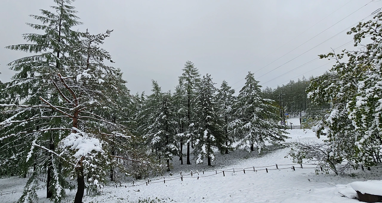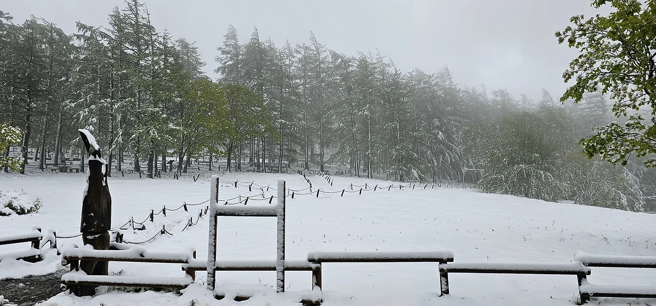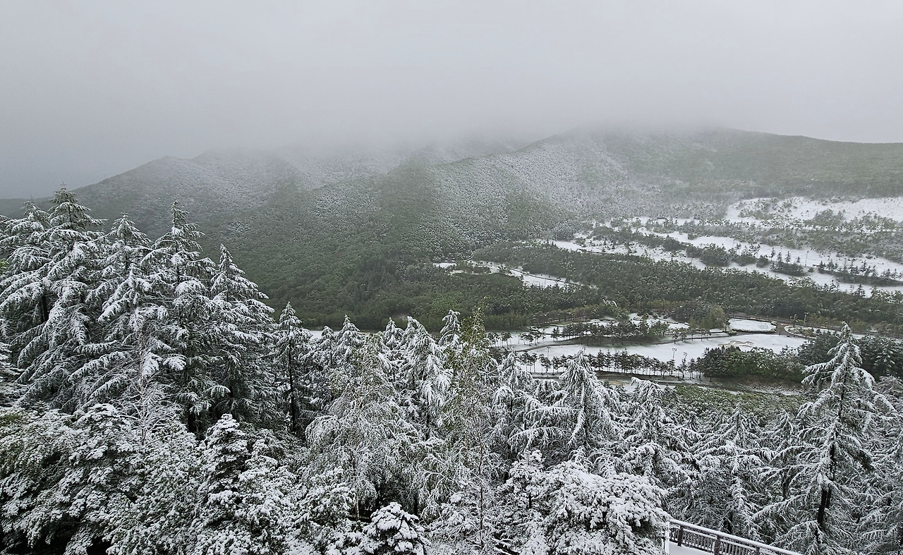 다음날 아침 일찍 눈이 떠져 일어났는데 밖이 평소보다 밝게 느껴져 먼저 창문 커튼을 열었다. 순간 두 눈을 의심할 수밖에 없는 놀라운 광경이 창밖에 펼쳐져 있었다. 바로 위의 사진과 같았던 초록의 산야가 아래 사진처럼 모두 하얗게 흰 눈으로 덮여 있는 것이 아닌가? 게다가 아직도 눈발이 가녀리게 흩날리고 있었다. 이렇게 놀라울 수가? 초여름에서 한겨울 풍경 속으로 순식간에 시간이동을 한 느낌이었다.