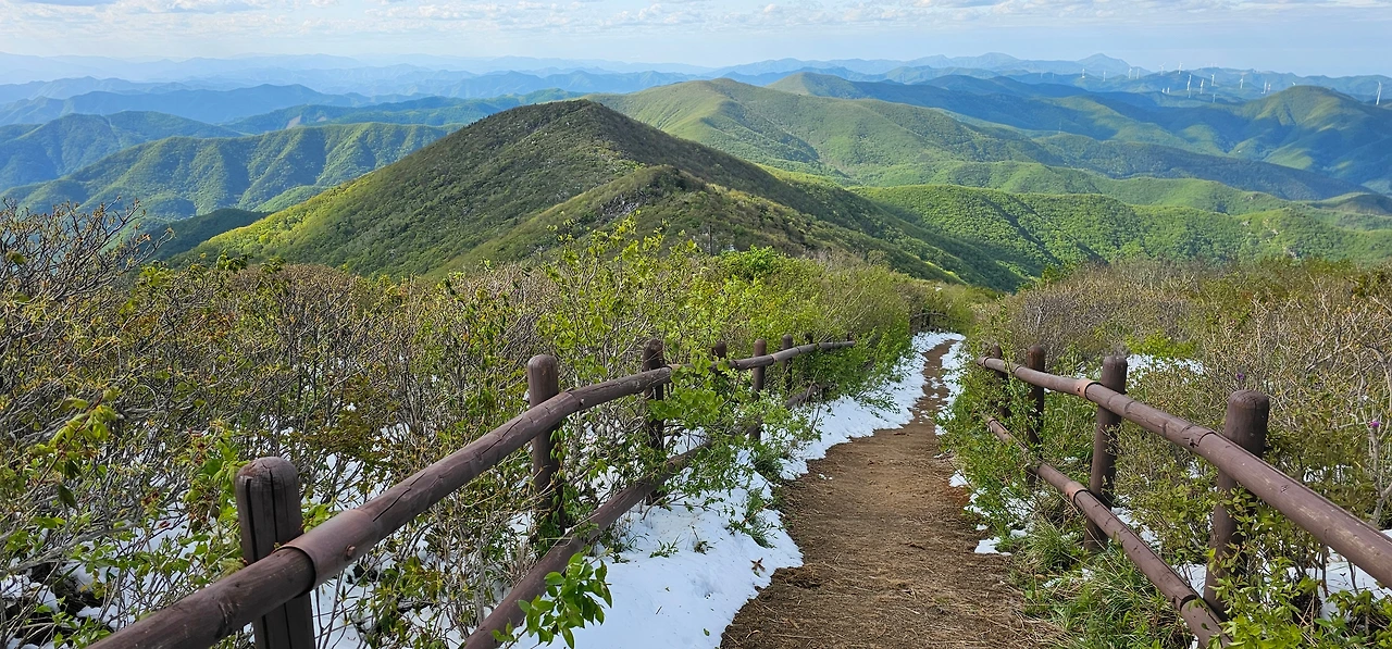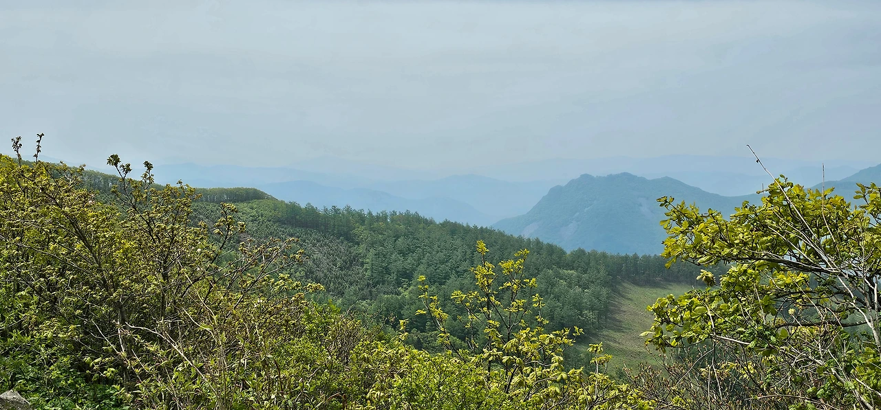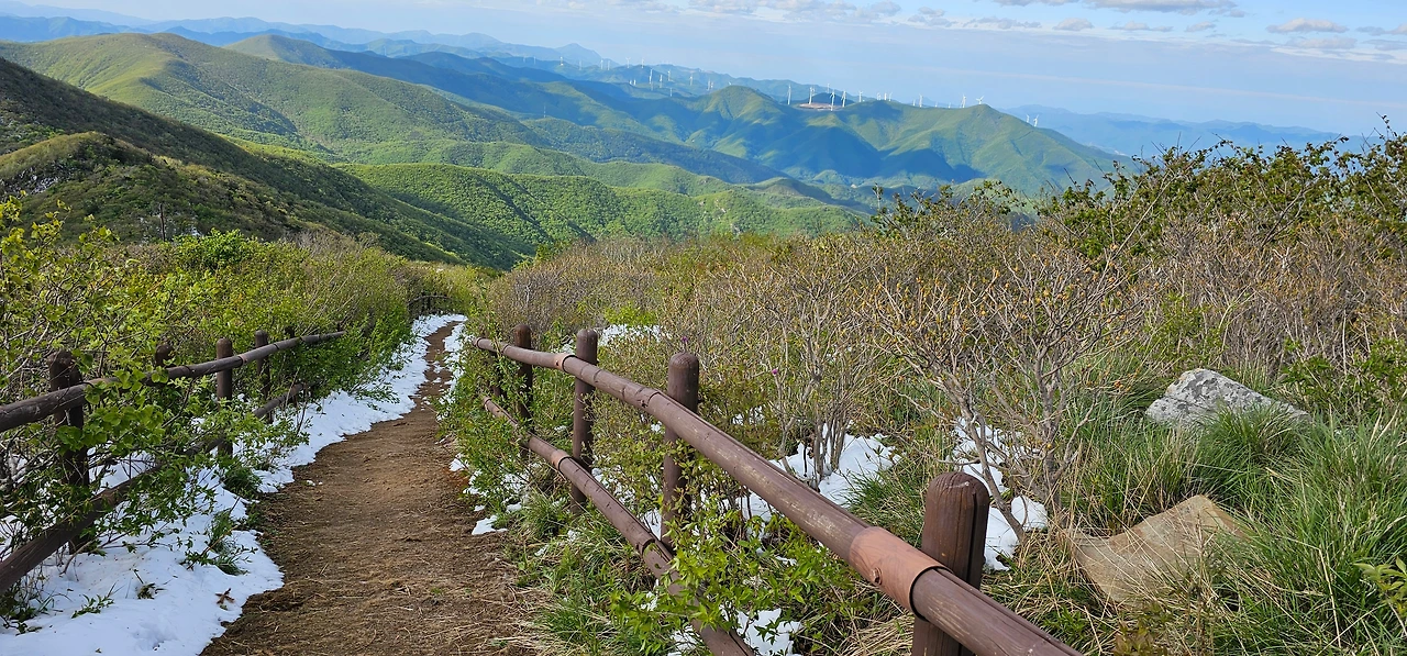 만항재 옆 산 길을 걷다 보니 전날의 연초록, 아니 바로 오늘 산아래의 연초록과 극적인 대비를 이루어 비현실적인 세계에 온 듯한 착각을 불러일으킨다.