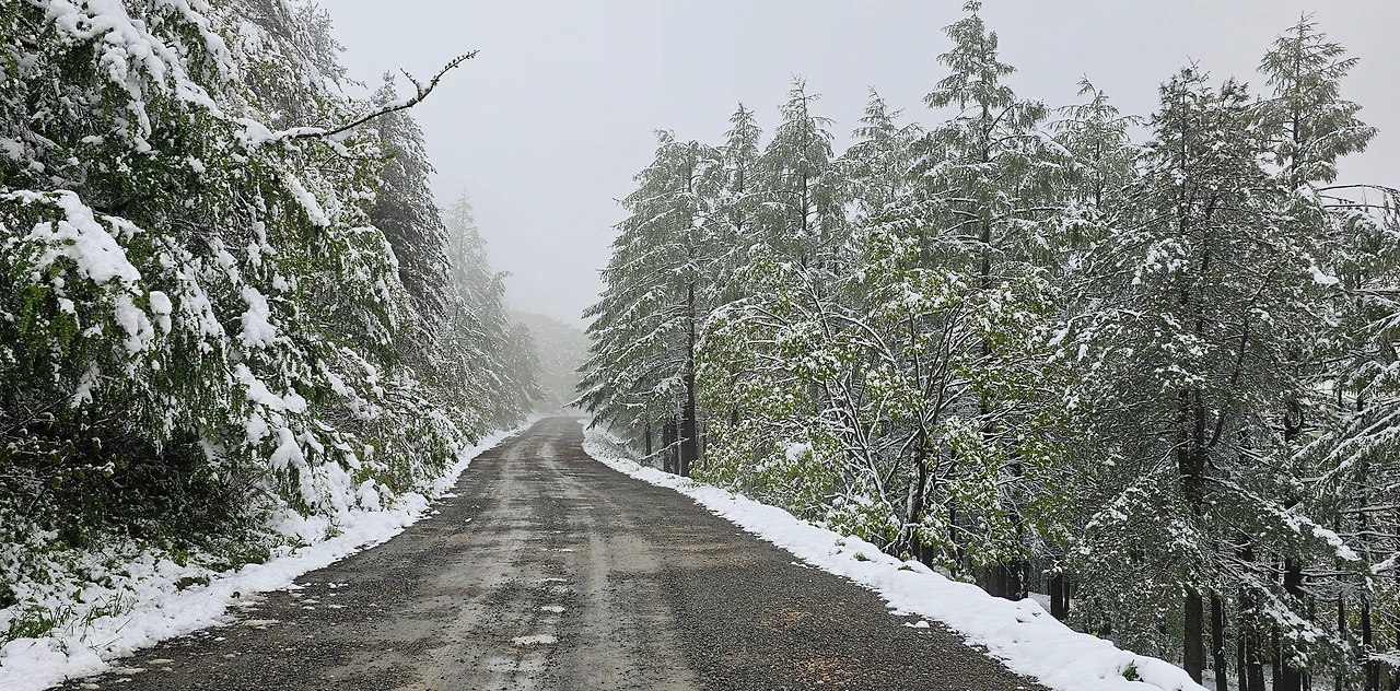 다시 산아래로 내려갔다가 만항재로 올라가는 고갯길을 올라가는 데 점차 팰리스 호텔과 같은 풍경이 재현되기 시작하였고 만항재에 도착하였을 때는 눈이 더 많이 와있다는 것을 알게 되었다. 그도 그럴 것이 만항재는 1330m로 우리나라에서 차로 올라갈 수 있는 최고의 높이라고 한다. 도착하여 차에서 내려 주변을 걸으며 사진을 찍어 보는데 이국적 풍경으로 변해버린 숲길과 눈을 뒤집어쓴 연초록 잎의 나무들이 좀처럼 보기 힘든 장면을 연출하여 주고 있었다.