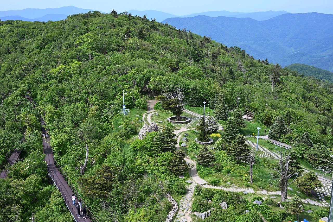용평 리조트에서 발왕산 케이블카를 타고 정상에 도착하니 산들이 부드럽고 온화하게 첩첩이 펼쳐져 있다. 아래 사진은 스카이워크라 불리우는 구조물에서 본 천년주목숲길.