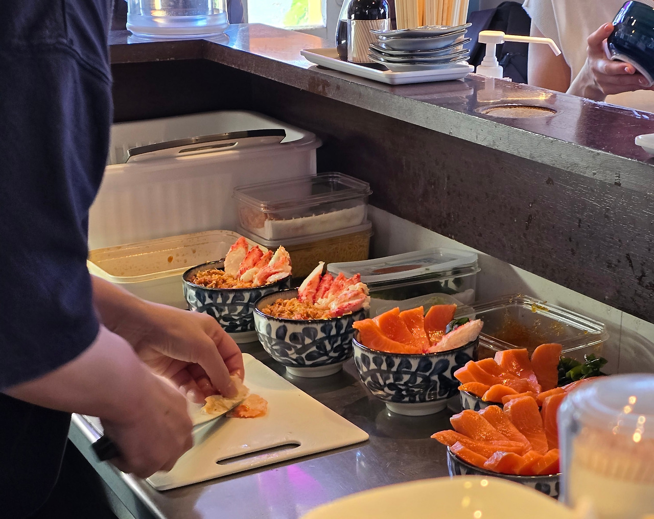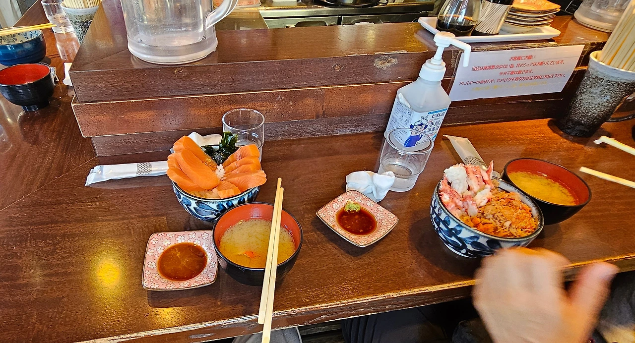 점심으로 우리 부부는 게살덮밥과 연어회덮밥을 시켜 반씩 나눠 먹으며 두 가지 덮밥을 먹어 보았다, 게살을 정성껏 발라 놓은 것과 연어 회, 그리고 쌀밥과 게 집게발 마지막 마디하나 들어간 깊은 맛의 장국이 맛있게 어우러져 허기진 배를 순식간에 달래주어 챗 gpt한테 배운 일본어로 '오이시 데스'하고 인사하며 나오니 6월 말의 북해도 이른 오후의 햇빛은 우리나라만큼이나 강하게 내리쬐고 있었다..
