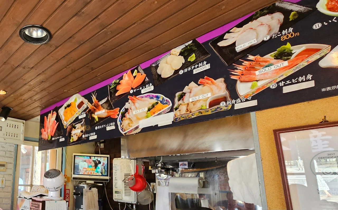 점심식사하러 들린 사와사키수산은 주방장을 대하며 둘러싼 형태의 손님 좌석이 10자리 정도인 작은 음식점이었는데, 마침 우리 가족이 앉을자리가 있어 둘로 나뉘어 앉게 되었다. 우리가 앉은 이후에도 사람들이 기웃 거리며 빈자리가 있는지 수시로 보고 지나갔고, 일부는 밖에서 자리가 날 때까지 기다리는 인기 있는 집이었다.매일 식재료를 받아 신선한 음식을 제공한다 하는데 음식의 맛의 제1 조건은 양질의 재료임을 다시금 입증하는 셈이었다.