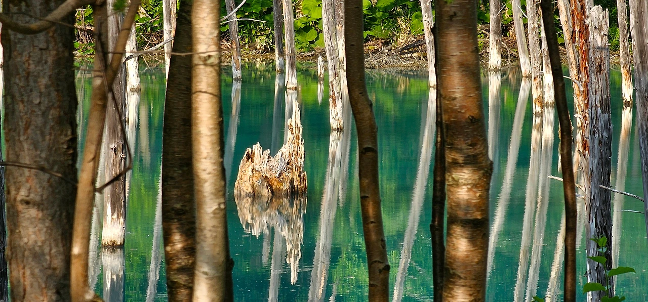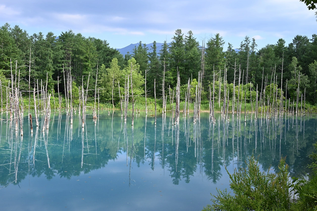 청의 호수'(青い池,)의 모습. 오묘한 물빛과 죽었지만 그 자태를 유지하고 있는 나무의 여왕 자작나무들이 어우러져 신비스러운 풍경을 자아내고 있다.