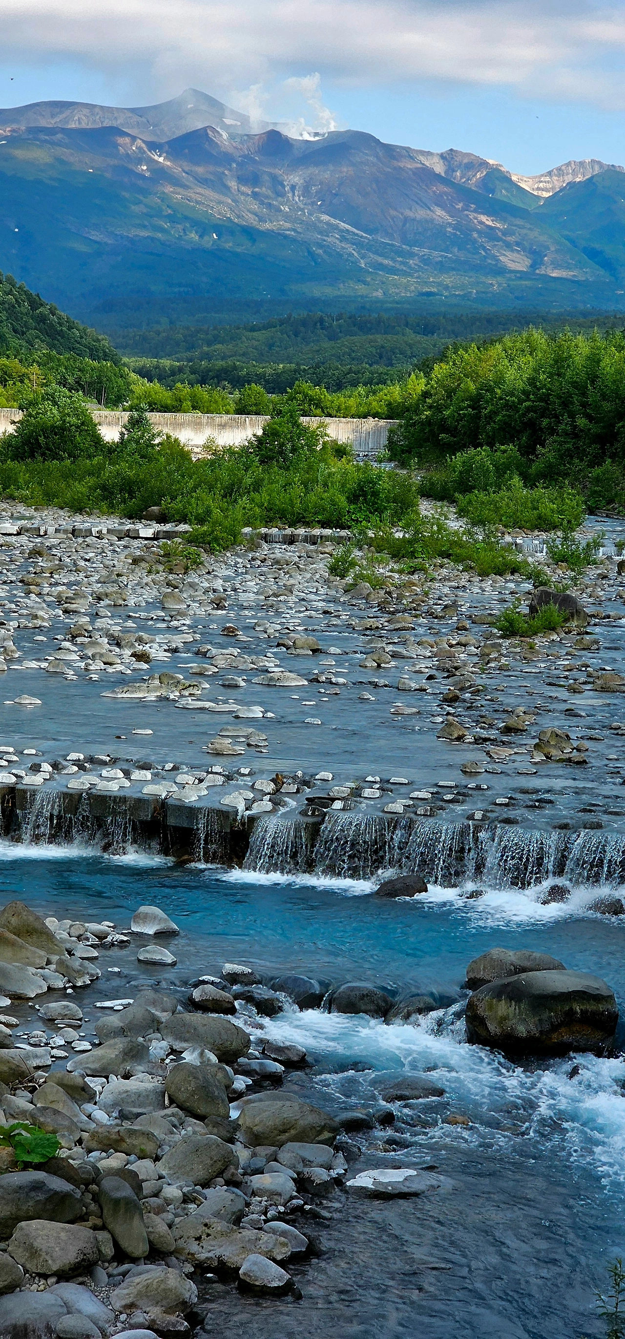 청의 호수에서 흘러내려온 큰 개울이 작은 폭포를 이루고 있고 저 멀리 화산의 모습도 보인다.