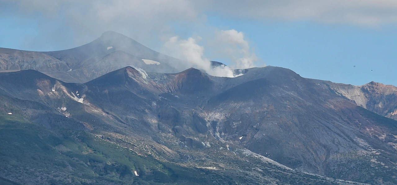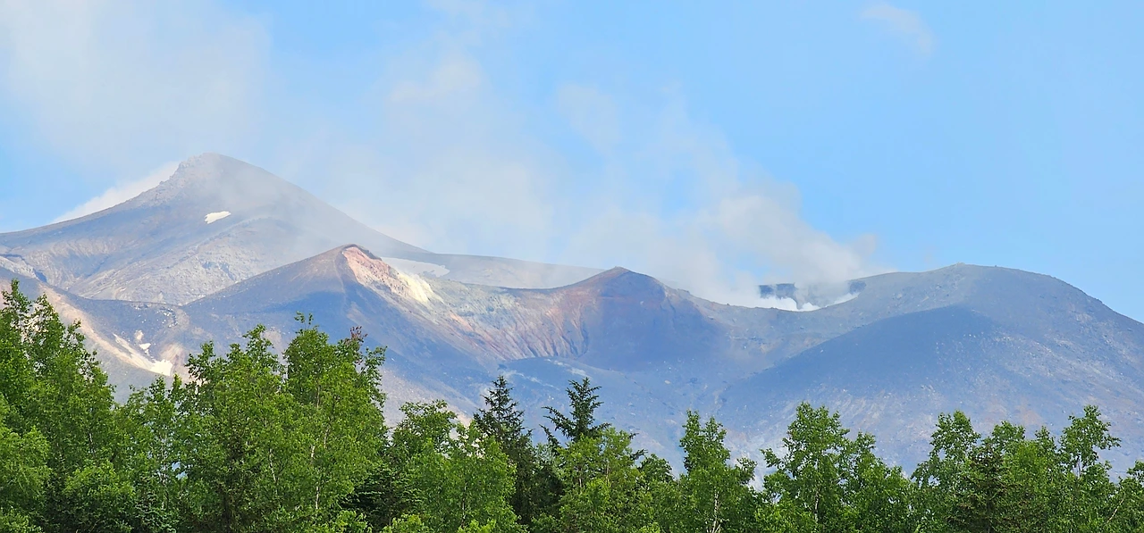 아사히다케(旭岳あさひだけ) 화산 정상에 연기가 피어오르는 모습
