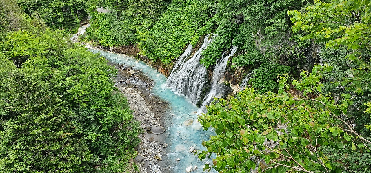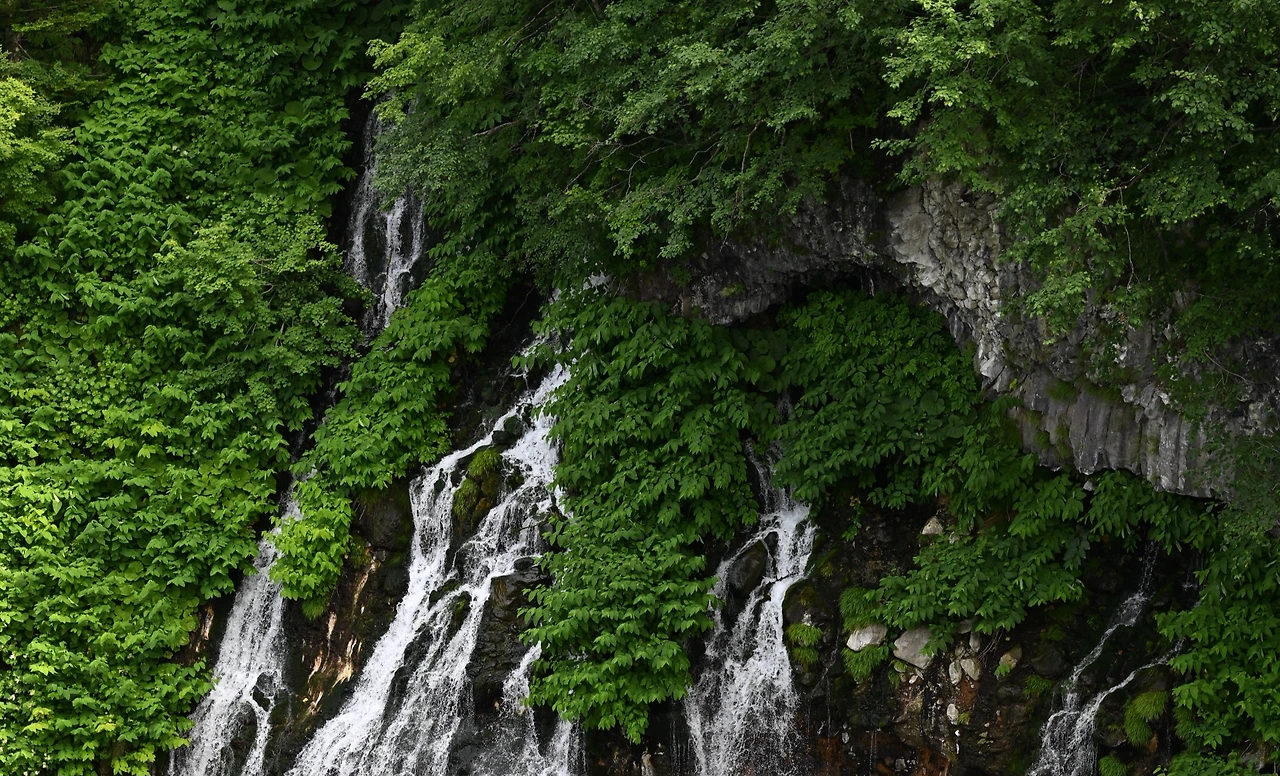 잠시 휴식을 취한 후 우린 오후 방문지인 비에이(美瑛에 있는 흰 수염 폭포와 청의 호수로 향하였다. 흰 수염 폭포(白ひげの滝)는 폭포의 여러 물줄기가 떨어지면서 하얗게 거품을 일으켜 흰 수염과 같아 보인다 해서 붙여졌는데, 다이세츠 산 국립공원(大雪山国立公園)에서 유입되는 물과 지하수가 두 암반층 사이에서 흘러나와 생긴 폭포라고 한다. 폭포에 대한 안내 문구에는 아래 암반층은 고대 용암의 부식 산물인 자갈과 모래층이고 윗 층은 용암이 흘러 굳은 암석 층이라고 하는데 이 사이로 물이 흐른 것이 폭포수로 흘러내린 다는 것이다.