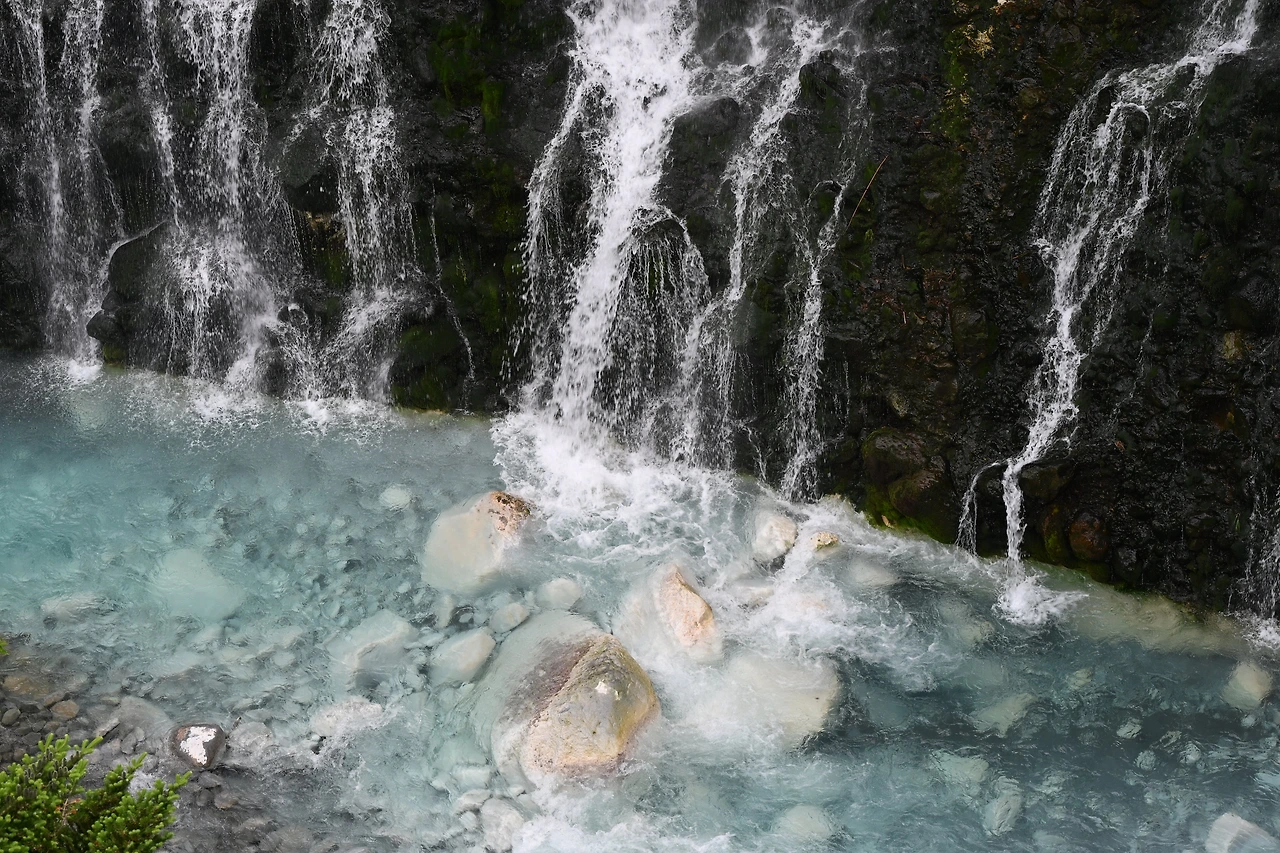 흰 수염 폭포(白ひげの滝)의 모습 물빛이 투명하고 맑디 맑으며 연한 옥색으로 신비로운 느낌을 자아낸다.