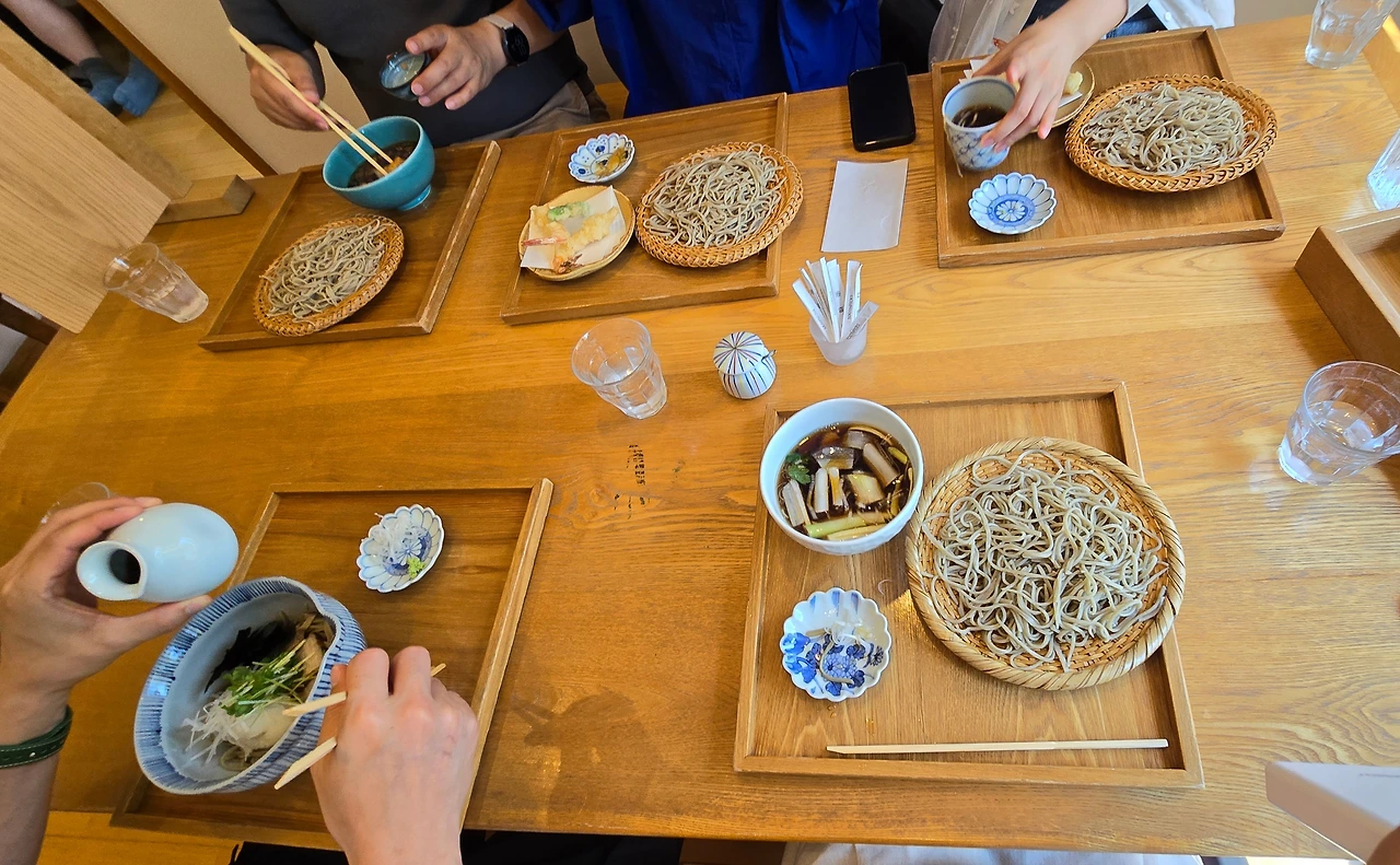 점심식사는 인근 유명 소바집을 찾았다. 테이블이 대여섯 개 정도밖에 없었는데 우리 앞뒤로 대기손님들이 끊이지 않아 현지인들에게 인기가 많은 집임을 알 수 있었다. 외국 관광객들은 많지 않았고 단체 관광객은 올 염두를 낼 수 없는 것이 좌석이 많지 않았기 때문이다. 덕분에 많이 기다리지 않고 식사를 할 수 있었는데나온 음식은 역시 한 그릇의 음식과 장국하나 혹은 면 한 접시와 어우러진 접시 하나로 끝이었다.