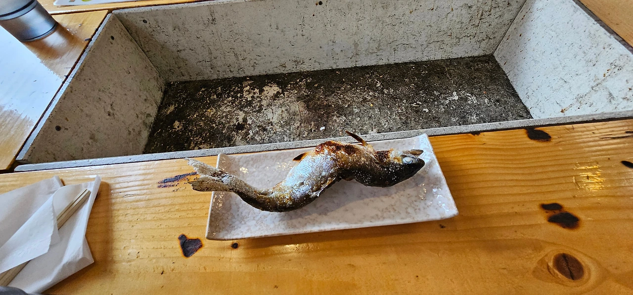 이곳에서 잡은 물고기로 생선 구이를 파는 집에서 라면도 팔아 점심식사를 하러 들렀는데 라면을 시킨 우리는 호기심으로 생선구이도 중간 사이즈로 한 마리를 시켜보았다. 생선의 비늘을 벗겨보니 연분홍 속살이 나타났는데 과거 송어 구이를 먹었을 때와 비슷해 보였지만 알고 보니 이곳에 서식하는 유명한 홍연어였다. 고소한 맛이 이 글을 쓰고 있는 지금까지도 입안에 맴돌고 있다.