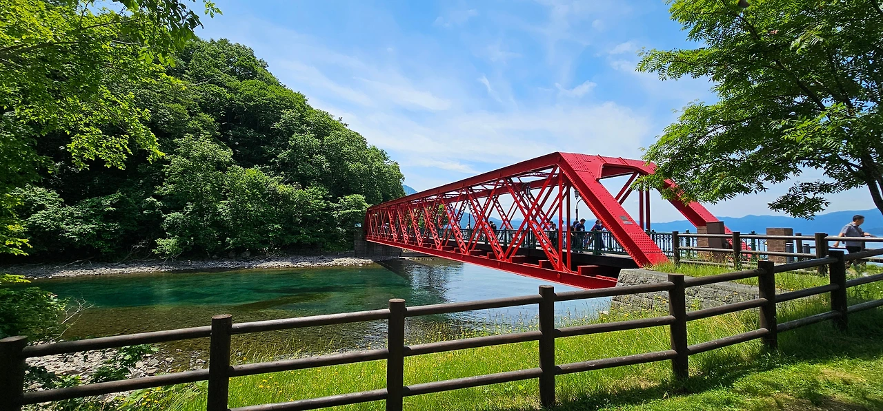 호숫가를 따라 진입한 관광지에는 잘 정리된 숙소들과 식당 카페, 관람선 선착장들이 펼쳐져 있었고 마침 주말을 맞아 작은 음악회가 열려 사람들의 흥을 돋우고 있었다. 나중에 주차장 우측이 더 넓은 공원의 공간이 있었는데 지형에 익숙하지도 않았고 표지판도 보지 않았던 우린 발걸음이 이끄는 대로 좌측 호숫가 길을 따라 걸어갔는데 우리 눈길을 끄는 빨간색 철교가 눈에 띄었다.야마센 철교(山線鉄橋)였다.