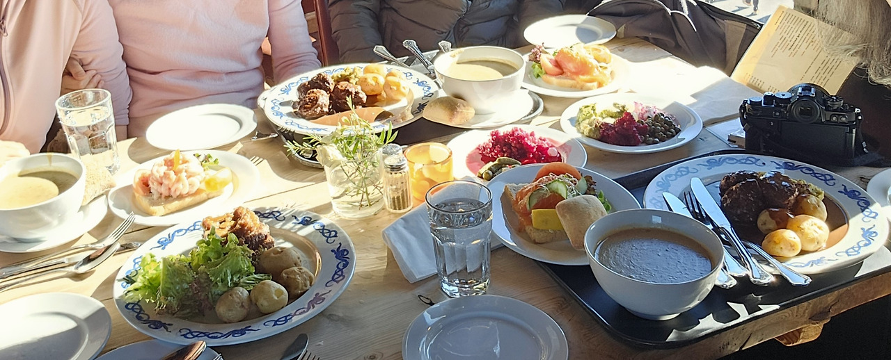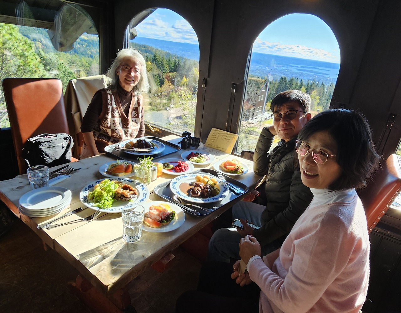 점심식사 때에는 L자매가 함께하면서 Frognerseteren 식당에서 하였다. 오슬로의 한 농장과 관련된 한 지역 이름인 Frogner와 산장이란 뜻인 seter가 합쳐진 단어인데, 이 식당은 전통적인 레스토랑으로, 풍부한 문화유산과 아름다운 자연환경 속에 자리 잡고 있고 Holmenkollen 스키 점프장 근처에 위치해 있어, 오슬로 전경이 보여 오슬로에 사는 사람들도 한가로이 식사하며 여유로운 시간을 보내거나 야경을 즐기곤 한다고 한다. 오슬로에 머물며 두세 번 들릴 기회가 있었는데 평일 점심에는 나이 드신 분들이 주로 많이 이용하셨다. 부부가 함께 오셔서 점심식사를 하는 다정한 모습을 볼 수 있었다. 노르웨이 통나무집 건축 스타일을 반영한 전통 목조건축 양식으로 지어졌으며, 지금까지도 그 건축 유산을 잘 유지하고 있다. 인기 메뉴는 Kanelbolle (시나몬 롤), Rømmegrøt이라는 전통적인 노르웨이 음식으로 사워크림과 밀가루버터로 만든 수프, 노르웨이식 사슴 고기 스테이크, 미트 볼 등이 있다고 하는데 우리는 Rømmegrøt(사우어크림수프)와 미트볼, 오픈 샌드위치, 사슴고기 스테이크 등 몇 가지 메뉴를 시켜 함께 먹었다.