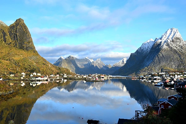 라이텐(Ryten) 트레일 코스를 가기로 한 날이 되었다. 트레킹을 응원해 주기라도 하듯 이 날은 유난히 날씨가 맑고 바람도 없어 아침 식전 레이네 마을을 가볍게 산책하였는데 마을이 품은 바다도 호수처럼 잔물결 하나 없어 거울처럼 마을을 둘러싼 장엄한 산들의 호위 진영을 그대로 비추어 주었다.