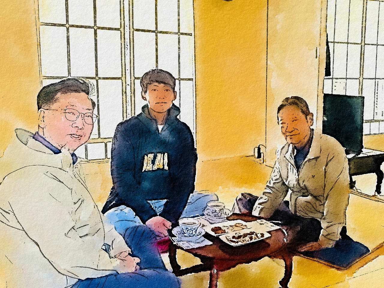 사랑채로 안내하고 단아한 찻상을 우리 앞에 내어 주셨는데 이 지역 전통 떡과 곶감을 차와 함께 내어 주셨다. 직접 다 만드신 것이라니 놀라움을 금치 못하였다. 가을에 감을 T자 모양으로 가지 일부를 포함하여 딴 후 껍질을 벗겨내고 주렁주렁 매달아 말리는데 7-8백 여개를 매년 말려 곶감을 만드신다고 하니, 그것도 직접 만드신다니 그 바지런하심을 누가 말릴 수 있으랴. 물론 지인들이 돕는다 해도 수백 개는 넉끈히 깎으신다니 감탄하지 않을 수 없었다. 그 말씀을 듣고 곶감을 한입 베어 먹어보니 여느 곶감과는 확연히 차이가 느껴졌다. 더 부드럽되 그렇다고 물컹거리는 것이 아닌 아주 입에 착 감기는 것이 일품이었다.