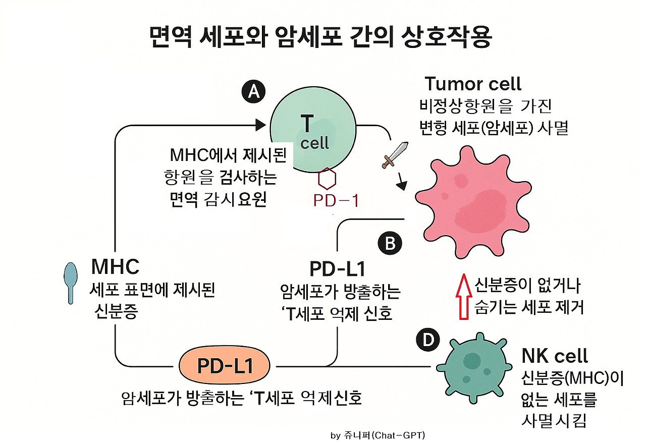 MHC를 통해 제시되는 정보는 각 세포의 고유 신분증인 셈인데 우리 몸의 면역 세포가 아군과 적군(병원체에 감염된 세포나 암세포, 이식된 타인의 세포 등)인지 식별하고, 공격 여부를 결정하는 중요한 정보를 제공한다. 세포 인식 측면에서 MHC에는 I, II 두 가지 종류가 있는데 이중 종양세포를 포함한 핵을 가진 세포는 MHC class I을 통해 정상 세포에는 전혀 존재하지 않고 오직 암세포에만 특이적으로 나타나는 종양 특이 항원 (Tumor-Specific Antigens, TSAs)인 항원물질을 제시하게 되는데 순찰 중이던 세포독성 T세포(CD8+ cytotoxic T cell)가 검문검색을 실시하던 중 비정상적 항원을 인식하게 되면 종양세포를 죽이게 된다. 이러한 신분증 제시는 Interferon-γ에 의해 강화되는데 무언가 면역계가 이상 징후를 감지하여 Interferon-γ와 같은 사이토카인을 분비하게 되면 각 세포들은 신분증 제시를 명확히 해야 함을 공지받게 되는 셈이다.