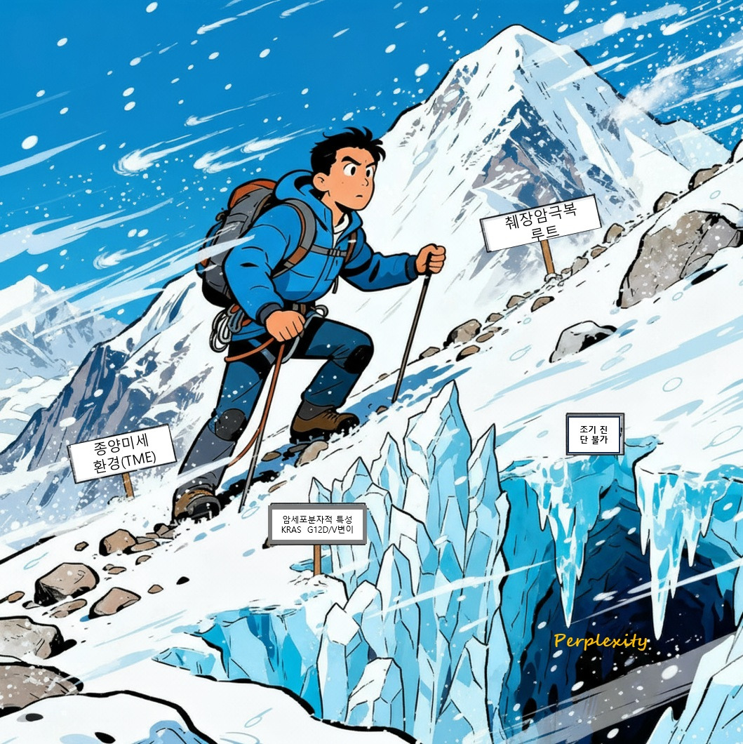 Than은 험준한 췌장암 산봉우리 정복에는 "암세포의 고유한 분자적 특성, 종양 미세환경(TME), 그리고 임상적 적용상의 난제"라는 극복해야 할 세 과제가 있다고 지적한다. 먼저 췌장암의 90% 이상에서 KRAS라는 암 유전자에 변이가 발견된다. 폐암, 대장암 등에서 발견되는 KRAS G12C 변이는 2021년 최초의 표적 항암제인 소토라십(Sotorasib, 루마크라스)의 승인을 시작으로 아다그라십(Adagrasib) 등의 개발로 이어졌는데 반해 췌장암에서 일어나는 KRAS 변이는 주로 G12D 또는 G12V 유형이며, 이는 G12C 억제제는 cysteine의 공유결합을 이용하는 기전인데반해 췌장암에서 보이는 G12D/V에는 cysteine이 없어서 이와 같은 약물이 결합할 만한 결합 주머니(covalent pocket)의 틈을 제공하지 않아 치료제 개발을 매우 어렵게 만들고 있다. 이로 인해 췌장암의 KRAS를 표적으로 하는 치료제 개발에 오랜 기간 어려움이 있었으나, 최근 항-RAS 활성을 가진 다양한 소분자 억제제들이 전 임상 및 임상 개발 단계에 있어 새로운 치료법이 도입될 것이 기대된다. 첫 번째 관문을 통과하더라도 다음 글에 다룰 예정인 종양 미세환경(Tumor Microenvironment, TME)의 문제가 도사리고 있다. 췌장암에서는 KRAS 변이로 인해 암-연관 섬유아세포(Cancer-Associated Fibroblasts, CAF)가 활성화되어 콜라겐과 같은 세포 외 기질을 과도하게 축적시켜 섬유성 장벽을 형성한다. 이 장벽은 항암제가 종양 내부 암세포에 도달하는 것을 방해하고, 동시에 산소와 영양 공급을 제한하여 독특한 면역억제적 미세환경을 조성함으로써 치료 저항성을 높인다. 이러한 이유로 흑색종, 폐암, 신장암 등 일부 종양에서 효과를 입증한 면역관문억제제도 췌장암에서는 아직까지 임상적으로 뚜렷한 이점을 제공하지 못하고 있다. 마지막으로, 대장암이나 유방암에서 효과적인 전략으로 자리 잡은 조기 발견을 위한 암 검진도 췌장암에서는 확립되지 않았다. 혈액검사에서 CA 19-9가 활용될 수 있으나 조기 발견에는 한계가 있고, 진단에서도 단독으로는 권장되지 않아 국가 단위 검진 프로그램으로 도입되지 못하고 있다. 이 때문에 대부분의 환자는 초기 증상 없이 진행된 단계, 때로는 이미 전이된 상태에서 진단되는 경우가 많다.