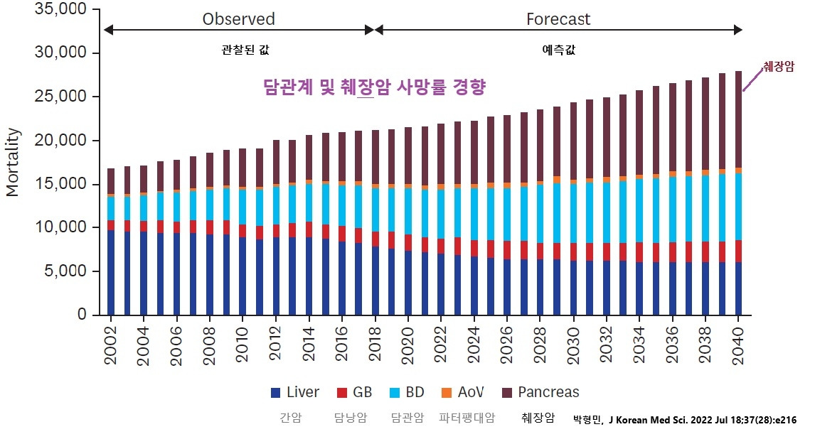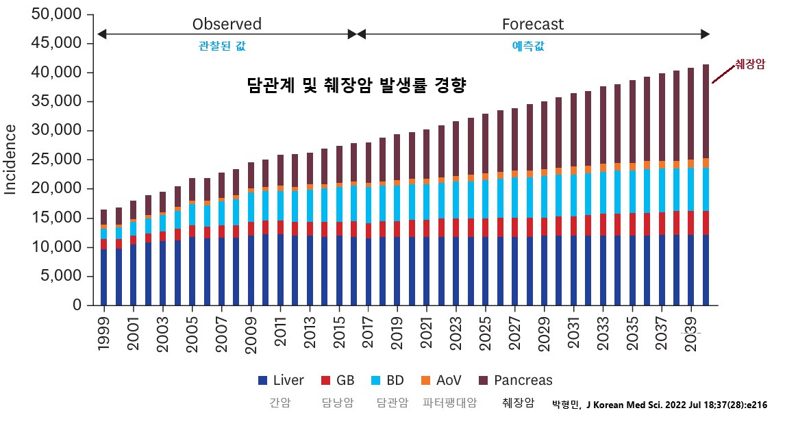 이러한 췌장암의 특성 때문인지, 박형민(J Korean Med Sci. 2022)의 우리나라 간담췌암(HBP cancers)의 발생률 및 사망률 추이를 분석하고 2040년까지 예측한 연구 결과를 보더라도 췌장암은 다른 암들과 달리 중요한 특징을 보인다. 1999년 대비 2017년 췌장암은 인구 10만 명당 5.6에서 7.3으로 증가하였고 연령표준화사망률도 5.5에서 5.6으로 소폭 증가하였으며 2040에는 발생률이 8.2까지 증가 할 것으로 예측되고 사망률도 증가할 것으로 예측되어 앞서 언급하였던 유방암처럼 증가 추세를 꺾을 전략이 필요한 암이다.