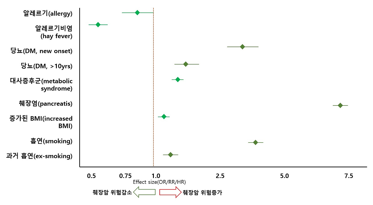 이상을 요약해 보면 상당한 근거가 있고 그래도 변화를 줄 수 있는 위험인자로 생각되는 것은 췌장염, 당뇨 특히 새롭게 당뇨병이 발병한 경우, 흡연, 대사증후군, BMI증가를 꼽을 수 있으며, 이에 반해 알레르기 질환과 건초열 즉 알레르기성 비염 같은 경우 췌장암의 위험을 줄이는 것으로 나타났다. 알레르기 질환에서 췌장암의 위험을 줄여주는 것은 흥미로운 관찰인데 이는 종양 침윤 호산구(Tumor-associated eosinophils, TAE)는 세포독성 과립을 분비하여 암세포를 직접 손상시킬 수 있고 케모카인과 사이토카인(CCL5, TNF-α, IFN-γ 등)을 분비해 T 세포, NK 세포 등 다른 면역세포를 종양 미세환경으로 끌어들이고 활성화시켜 면역 감시(immune surveillance) 기능을 강화함으로 그럴 수 있다는 추측을 할 수 있다. 이제 위험 요인들에 대해 살펴보도록 하자.
