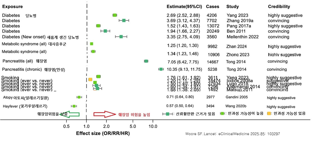 다음 그림은 Moore연구의 연구 결과에서 인과관계의 관련성에서 신뢰성에서 비교적 높게 평가된 위험인자들에 대해 재구성한 것이다. 원저자들의 허락을 받고 재구성한 것은 아닌 점을 감안하고 참고 수준으로 봐주면 좋겠다. 효과크기(effect size)가 1 이상일수록 췌장암의 위험의 강도가 커지고, 1 이하의 경우는 오히려 보호효과가 있는 것으로 해석된다. 짙은 초록색은 그 근거의 수준이 높은 것이고 옅은 초록색은 그보다는 못하지만 상당히 인과성이 있을 것으로 추정되는 근거라고 생각하면 된다.