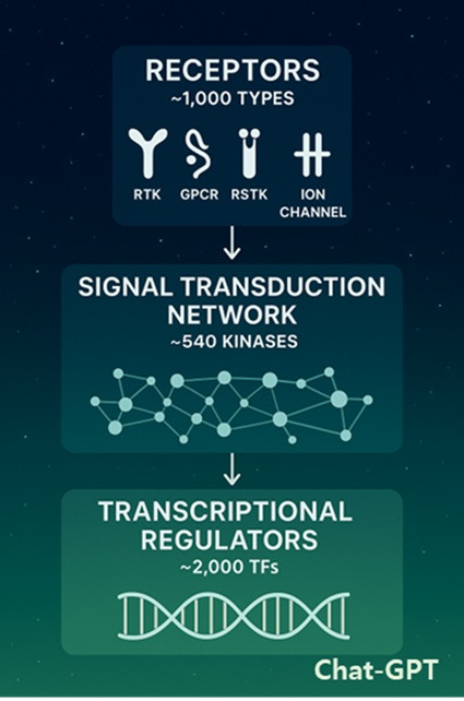 1,000여 종의 수용체가 외부를 감지하고, 540여 개의 키나아제가 신호를 이어주며, 2,000여 개의 전사인자가 핵 속에서 결정을 내린다.