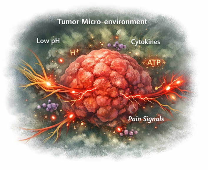 최근에 종양미세환경(tumor micro-environment:TME)과 통증의 관계에 대한 중요성이 부각되고 있다. TME 내의 화학적 변화 중 저산소증과 산성 환경(low pH)과 암세포, 면역세포, 기질세포들은 ATP, 프로스타글란딘, 사이토카인, 신경성장인자 등 다양한 화학물질을 말초 신경 말단에 존재하는 특정 통각 수용체와 결합하여 신경을 자극하고, 그 결과 통각과민 상태를 유발한다. 이 과정에서 통증 역치(pain threshold)가 낮아지면, 평소라면 견딜 수 있었을 약한 자극조차 극심한 통증으로 인식될 수 있다. 나아가 통증이 아닌 자극, 예를 들어 옷깃이 스치는 정도의 접촉조차 통증으로 느끼는 이질통(allodynia)이 발생하기도 한다.