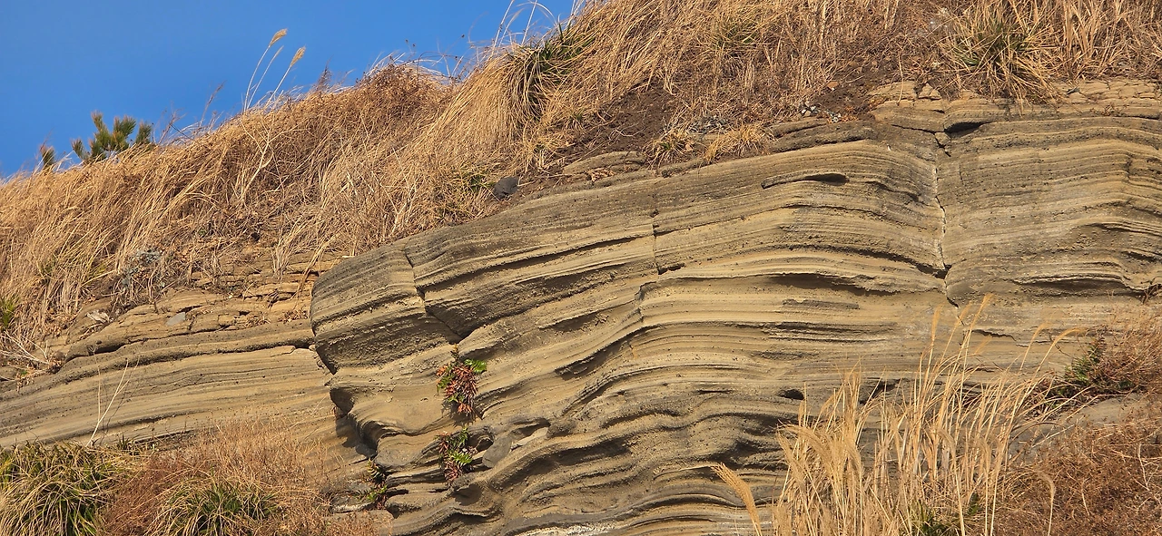 도착한 곳은 지질 지형이 특이한 곳인 모양이었는데 올레길 12코스의 일부구간인 곳이었다. 바다 건너로 차귀도와 와도가 보이고 왼쪽으로는 수월봉도 보였다. 그곳에 주차하고 하이헬로블루카페로 갔다. 다소 높은 곳에 위치해서 전망이 좋았고 아내가 원하는 음료도 있었고 카페 주인장도 상냥하고 친절한 분이었다. 주문한 커피를 마시고 해가 지는 것을 기다리다 시간이 아직 남아 나는 해변가 길을 걷고 싶었다.