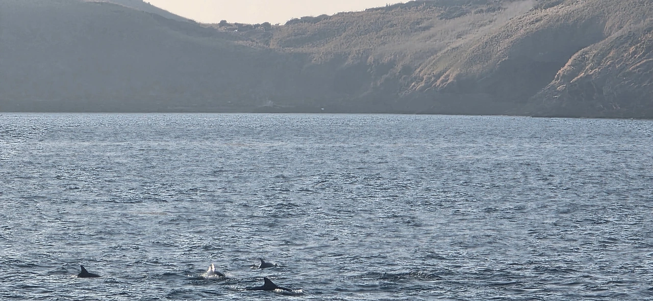 가족은 카페에 남아 있고 바람이 다소 세게 부는 해변가로 옷깃을 여미며 걸어갔다. 바다가로 난 길 한쪽으론 벼랑 같은 산기슭이 이어지고 있었는데 다소 기이한 지질적 구조가 있었다. 바다를 바라보며 걷고 있었는데 바다 저 멀리서 돌고래로 보이는 물체들이 바다 수면을 오르내리며 오고 있는 것이 보였다. 바람의 깃털이 바다 수면을 스치며 지나고 남방 큰 돌고래 십여 마리가 왼쪽에서 다가오고 있었다. 깜짝 놀라 가족들에게 전화로 돌고래가 오고 있다고 빨리 내려오라고 하고 바닷가 쪽으로 나 있는 전망장소로 달려갔다 그곳에 몇몇 사람들이 바다를 바라보고 있었는데, 나는 체면이고 뭐고 "돌고래다!"라고 여러 번 외쳤다. 주변에 있던 사람들이 나의 외치는 소리에 놀라 다 바닷가 전망 장소로 몰려왔다.
