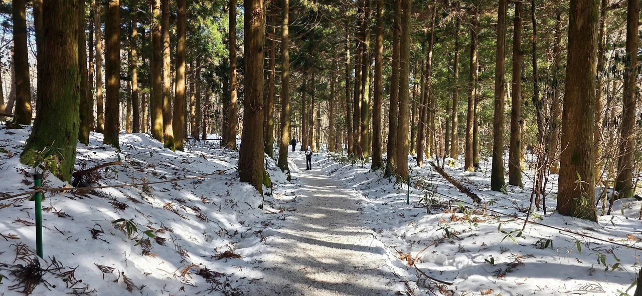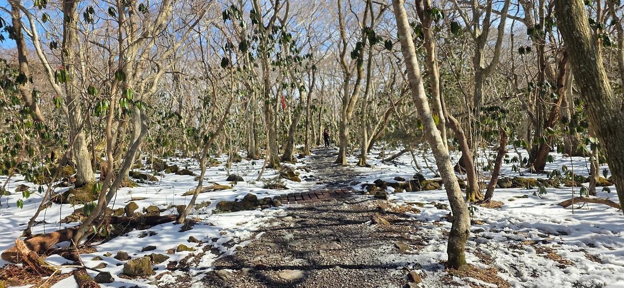 오르는 길 주위엔 굴거리나무와 조릿대, 서어나무들이 보였고 중간에는 울창한 삼나무 숲도 보였다. 동절기에는 11:30에 입산이 통제가 되는데 우린 10시경에 오르기 시작하여서 그런지 산에 오르는 동안 사람들이 별로 보이지 않았다. 간간이 몇몇 사람들이 지나칠 뿐이었다. 나중에 속밭 대피소에서 보니 그 이상 올라갔다 내려온, 몹시 피곤해 보이는 사람들이 여럿 보였다. 산에는 녹지 않은 눈이, 하늘은 가을 하늘처럼 파란 것이 나무들 사이사이 보이며 맑은 공기가 폐부 깊숙이 들어오니 완만히 지속적으로 오르는 길이 지루할 듯하다가 청량감으로 다시 신선해 지곤 하길 반복하는데 어느덧 오늘의 목표 속밭 대피소까지 왔다. 그곳엔 세면 시설이 아예 없는 화장실과 대피 시설 그리고 야외 의자들이 있었고, 햇빛이 따사로워 우린 야외 벤치에서 전날 세컨드 밀 빵집에서 사 가지고 간 샌드위치와 끓여 온 뜨거운 물에 탄 코코아 한잔으로 점심식사를 하였다. 이것이 호사가 아니고 무엇일까?