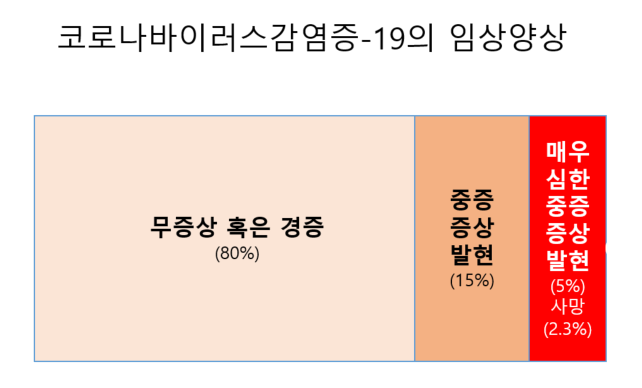 감염된 사람의 4-32%가 무증상자라는 보고가 있는데 진단 당시 무증상이지 시간이 지나 증세가 발생할 수 있으므로 해석에 주의를 요하는데, 우리나라의 보고에 따르면 무증상이거나 증세가 경미하여 지역 격리센터에 입소한 632명 중 끝까지 증세가 없었던 사람이 371명으로 58.7%에 달하여 상당수 감염된 사람들이 무증상인 경과를 보이는 것을 알 수 있다.
