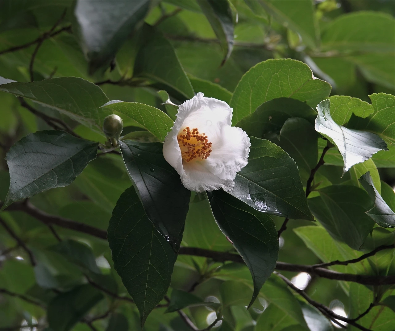 노각나무는 한여름에 순결한 하얀 꽃잎을 레이스 처리하여 살짝 주름을 잡아 피어냈다. 꽃술은 다정다감하게 옹기종기 학교 운동장에 모인 어린아이들 같기도 하다.