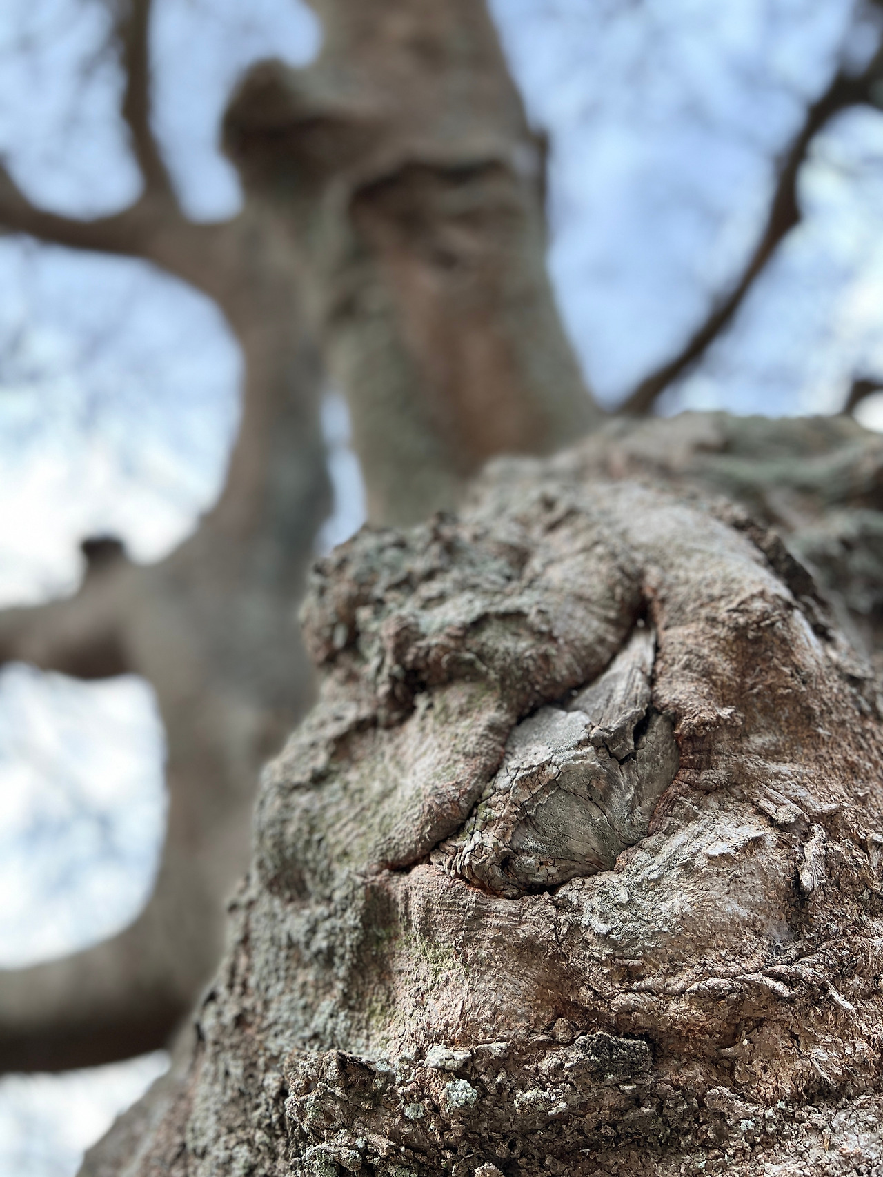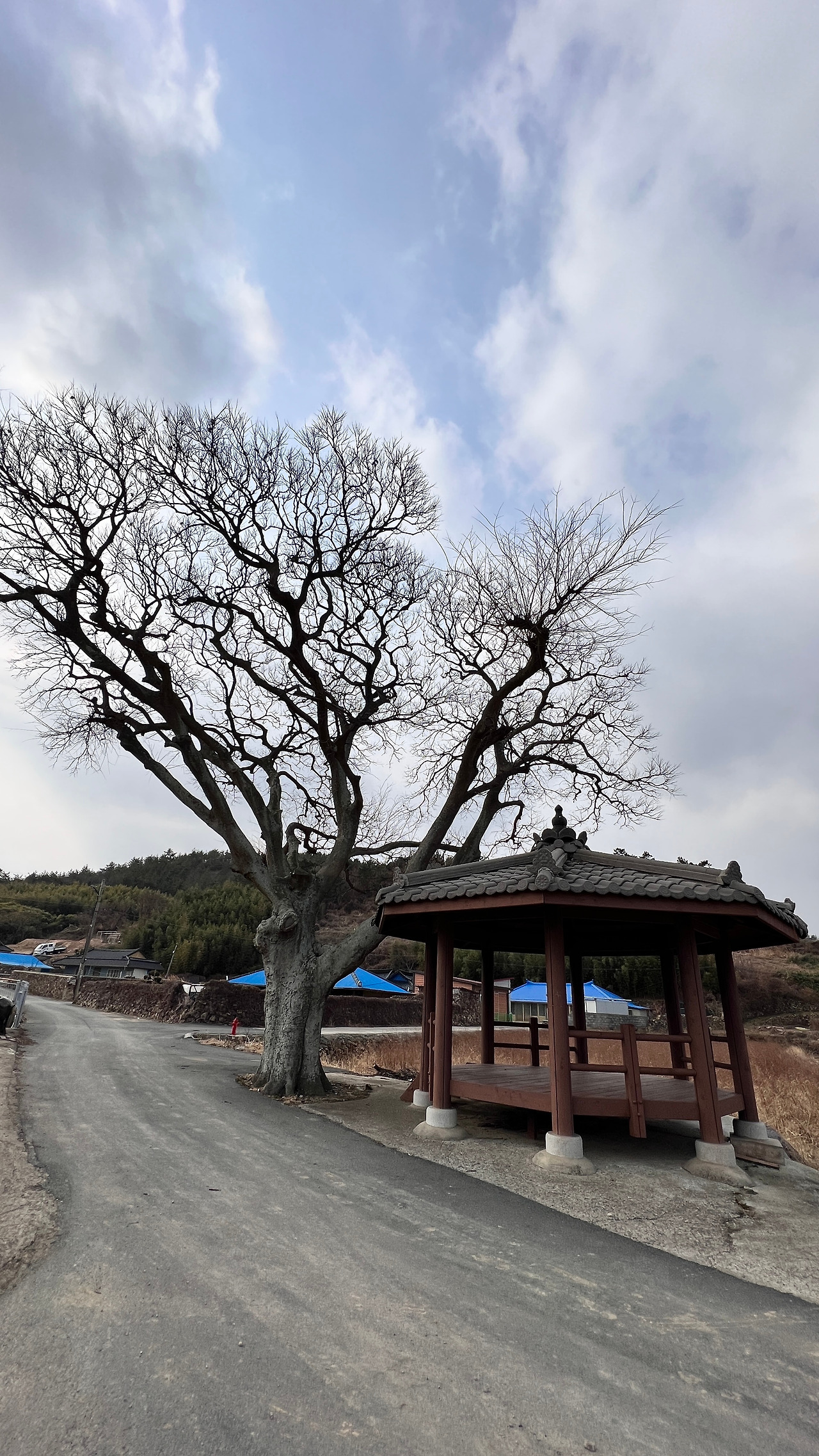 신안군 자은면 송산리 612에 있는 350년 된 팽나무이다. 일반적인 팽나무라면 자연스럽게 자라서 가지도 부러지고 썩은 곳도 있을 터인데 여기 나무는 뭔가 관리가 잘 되어온 나무처럼 보인다. 자세히 보니 가지치기뿐만 아니라 꾸준히 마을 사람들에게 사랑을 받아 왔다는 느낌이 들었다. 멀리서 보면 정갈하게 해 보인다. 팽나무는 열매가 동그랗게 생겼는데 그것을 작은 대나무 대롱에 넣어 밀어 넣고 대나무 꼬챙이로 밀어 넣으면 '팽'하며 날아간다. 가을에는 열매가 노랗게 변하면서 결국 빨갛게 변한다. 노란색일 때 새콤달콤한 맛이 나고 씨가 있다. 바닷가에는 해풍이나 소금물을 잘 견뎌서 포구에 많이 심어서 포구나무로도 불린다. 유독 여기 신안의 섬에서 포구나무가 잘 관리되어 자란 느낌이 든다.